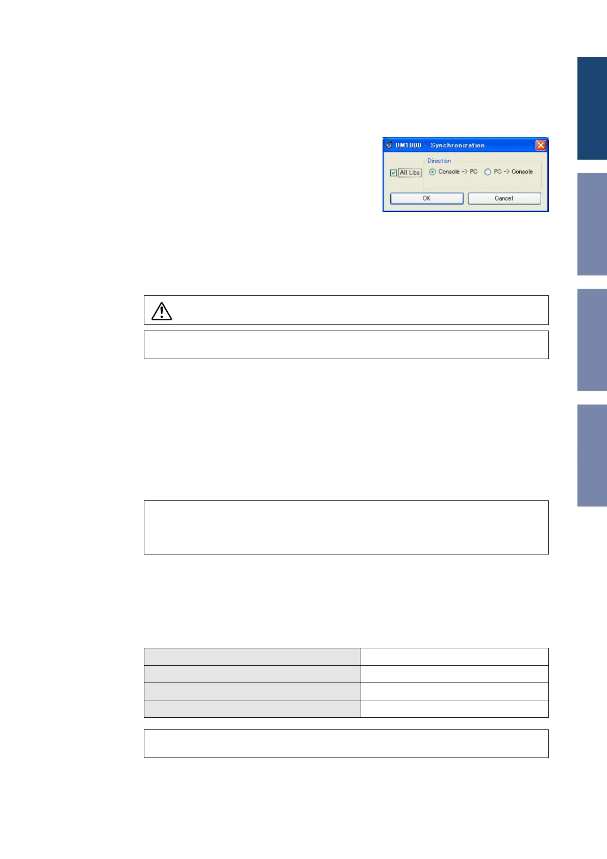 console with those in DM1000 Editor. This operation is called “synchronization.” Follow the steps