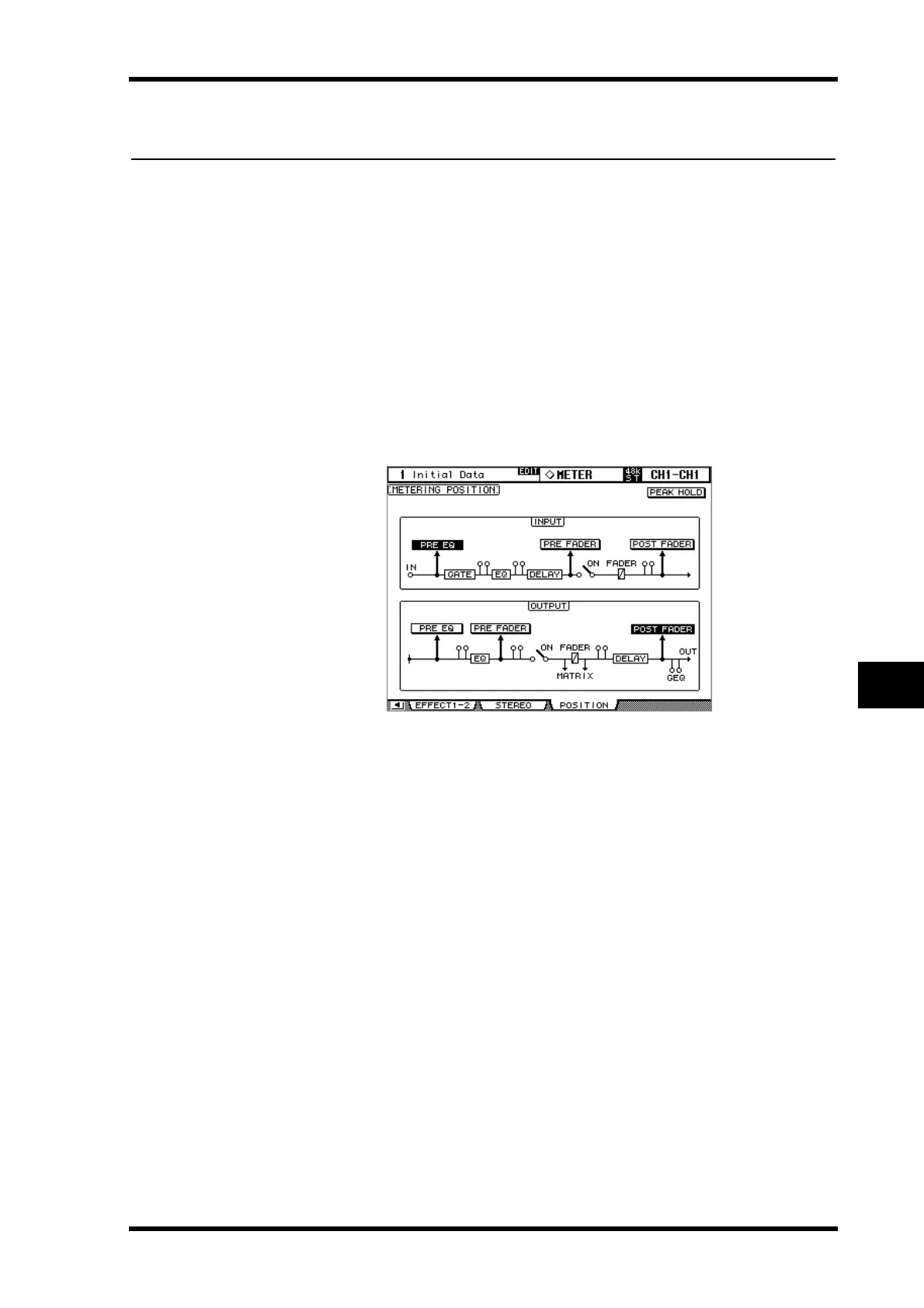 Input and Output Channels can be metered pre-EQ, pre-fader, or post-fader. This setting,