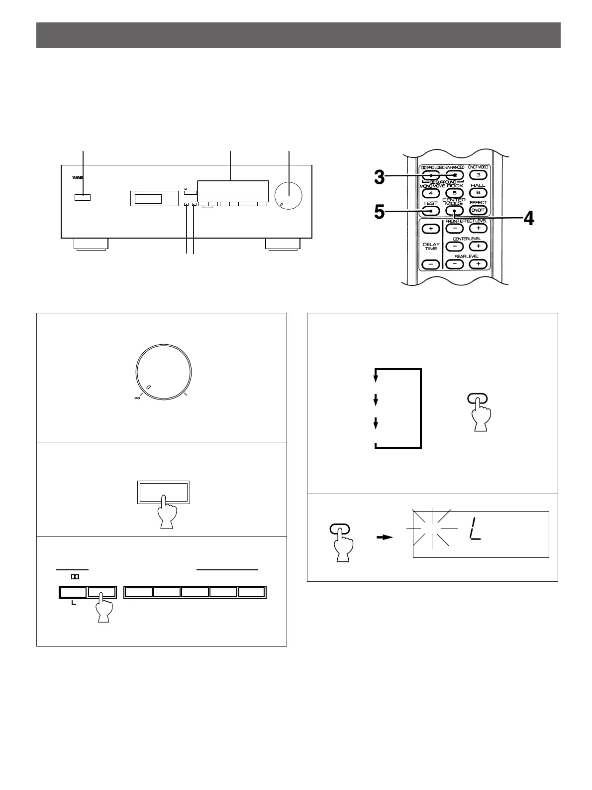 The adjustment of each speaker output level should be done at your listening position with the remote control transmitter.