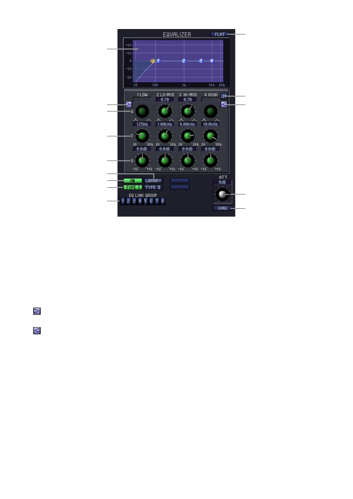 These knobs adjust the Q, center frequency, and boost/cut amount for the four bands LOW, LO-MID, HI-MID,