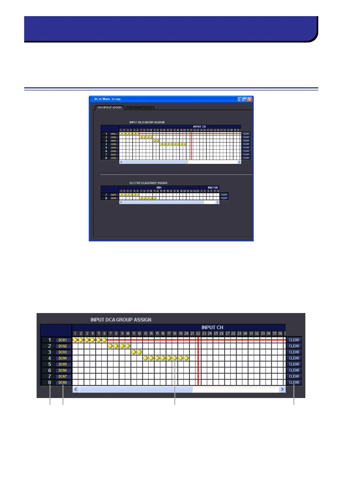 assign input channels to DCA groups, and the lower part of the screen lets you assign output channels to DCA