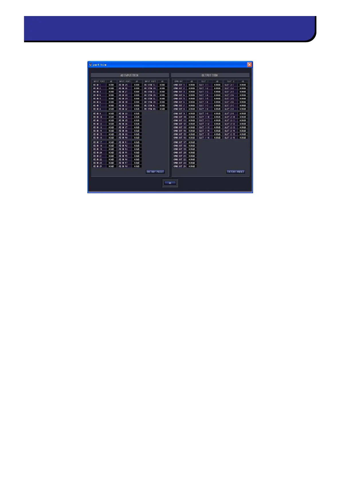 all input ports to their factory-set state, click the FACTORY PRESET button. When you click the OK button, the Port