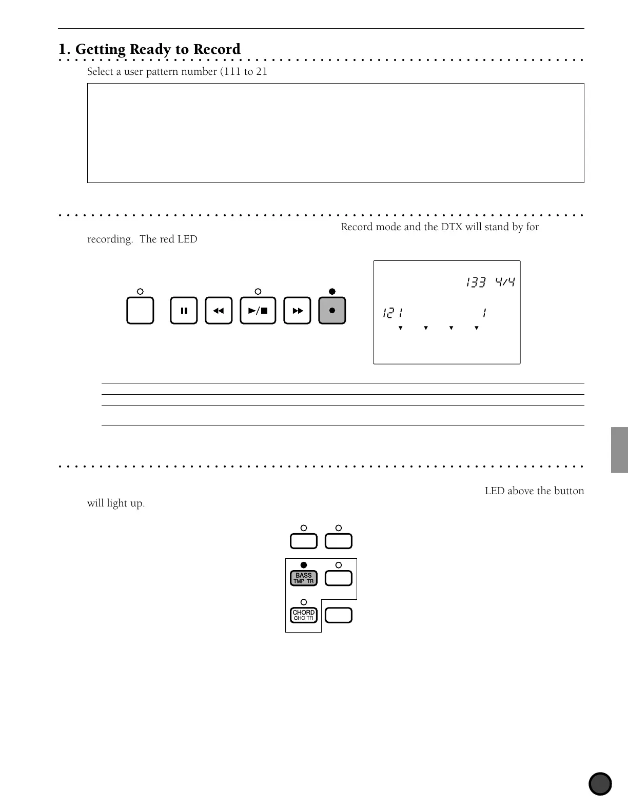 By pressing the RECORD button, you will enter Pattern Record mode and the DTX will stand by for