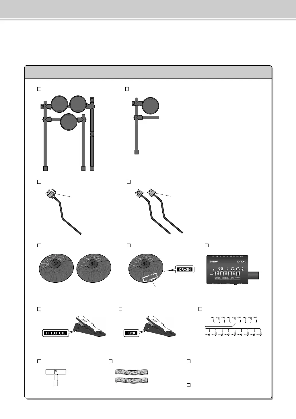 Cymbal/hi-hat pads (×2) Crash cymbal pad Drum module