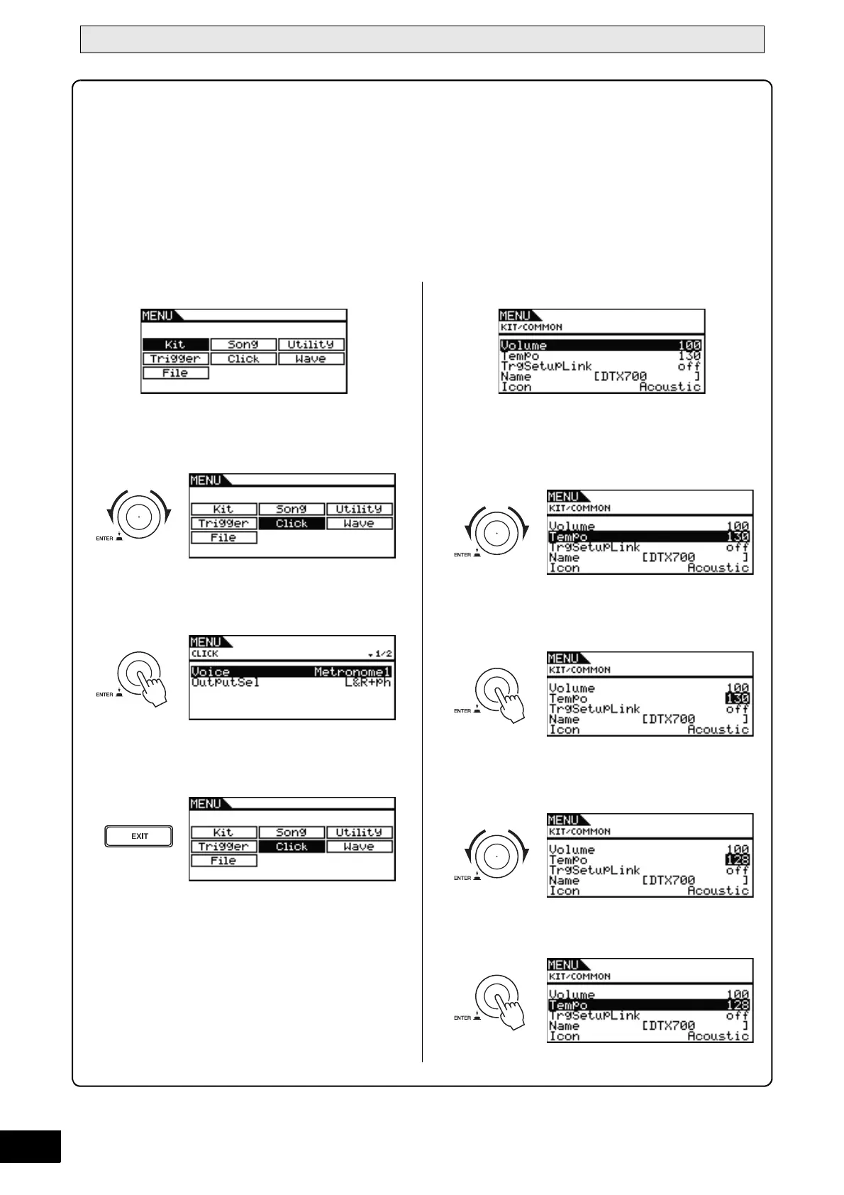 The pages of your DTX700’s Menu area provide access to a wide range of highly-useful settings. To access this area, simply press