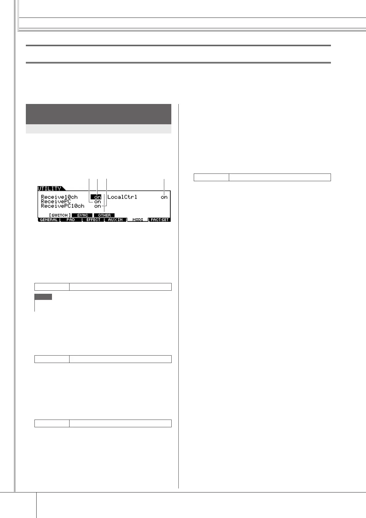 From these displays called up via the [F5] MIDI button, you can set the MIDI related parameters. The tone generator block