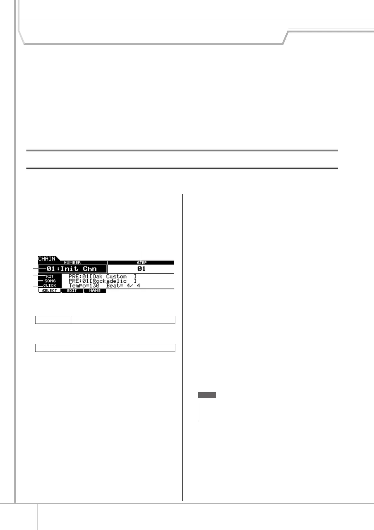called up in order one by one by selecting a Step number in the [F1] SELECT display in the Chain mode or hitting the
