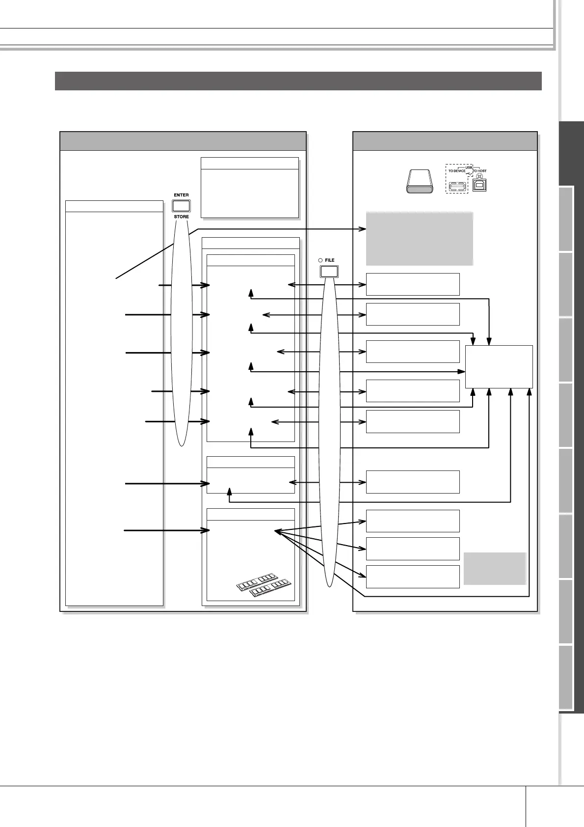 This diagram details the relationship among the functions of the DTX900 and the internal memory and USB storage device.