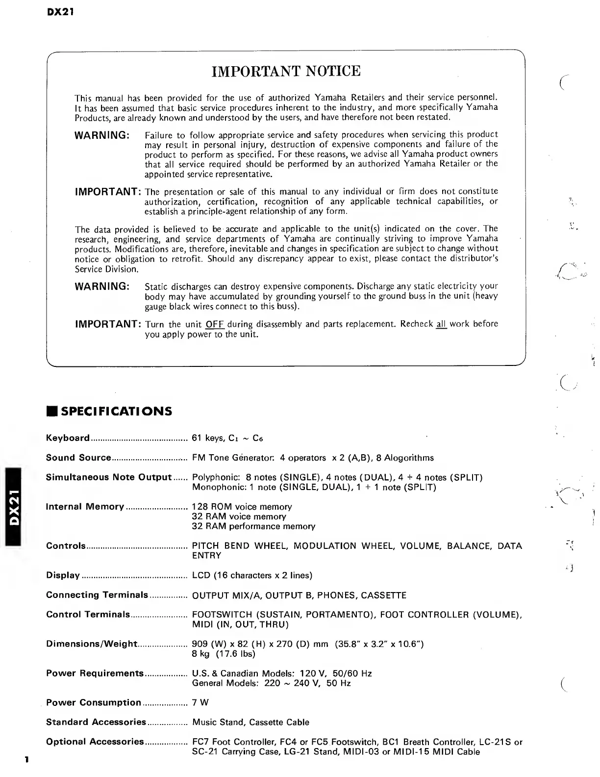 Yamaha DX21 - IMPORTANT NOTICE; SPECIFICATIONS