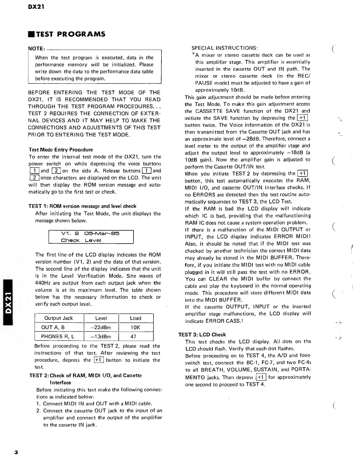 Yamaha DX21 - TEST PROGRAMS; Test Mode Entry Procedure; TEST 2: RAM, MIDI I;O, Cassette Interface Check