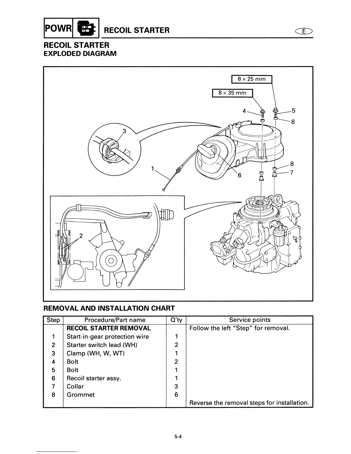 Yamaha E40X - Recoil Starter Exploded Diagram;Removal and Installation Chart