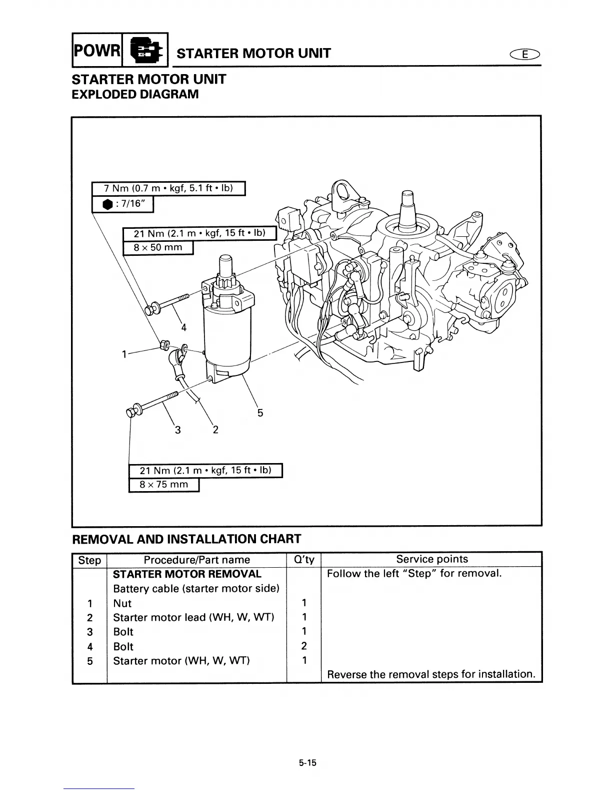 Yamaha E40X - Starter Motor Unit Exploded Diagram;Removal and Installation Chart