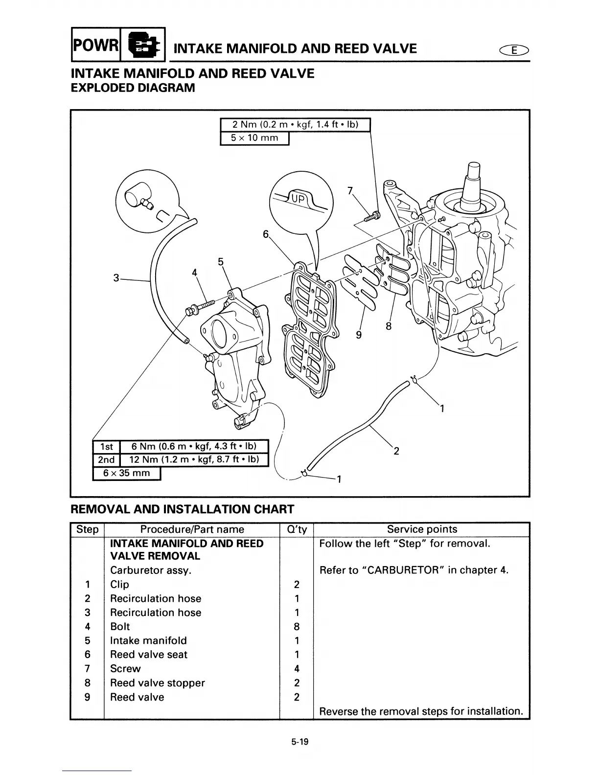 Yamaha E40X - Intake Manifold and Reed Valve Exploded Diagram;Removal and Installation Chart