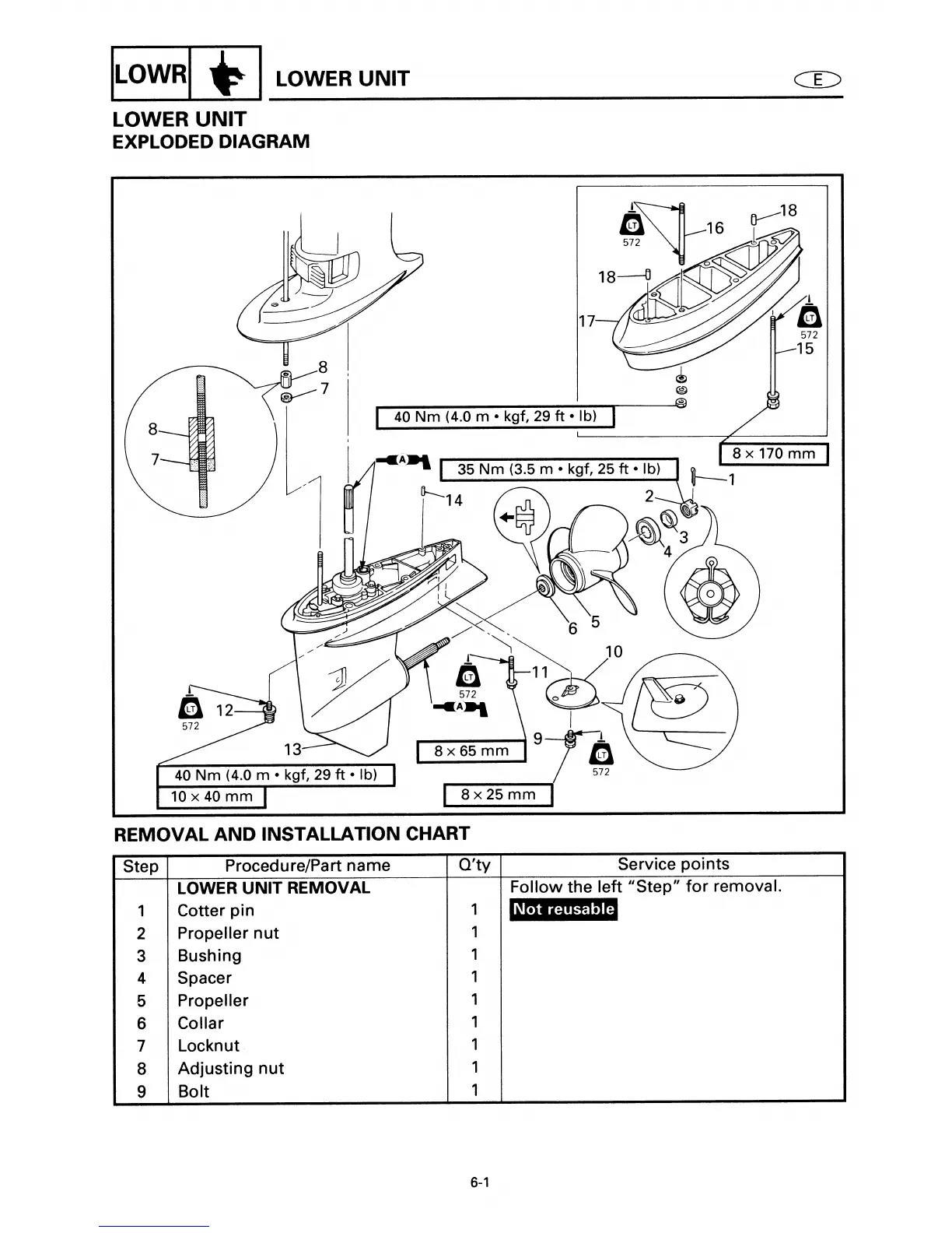 Yamaha E40X - Lower Unit Exploded Diagram;Removal and Installation Chart