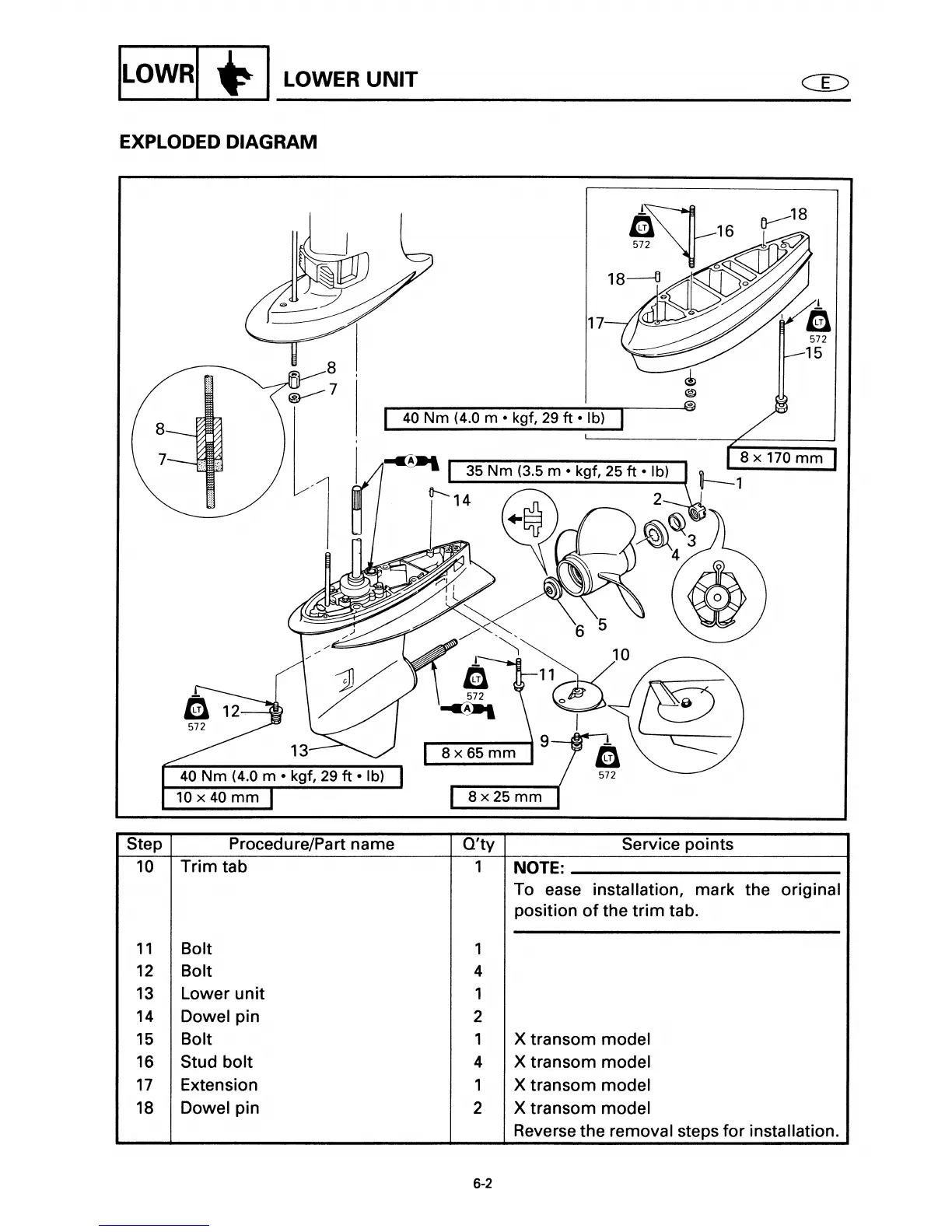 Yamaha E40X - Lower Unit Exploded Diagram;Removal and Installation Chart (Cont)