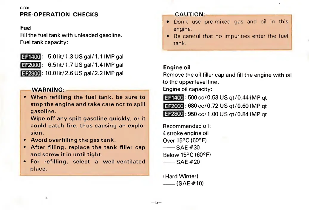 Yamaha EF1400 - Pre-Operation Checks; Fuel and Engine Oil Procedures