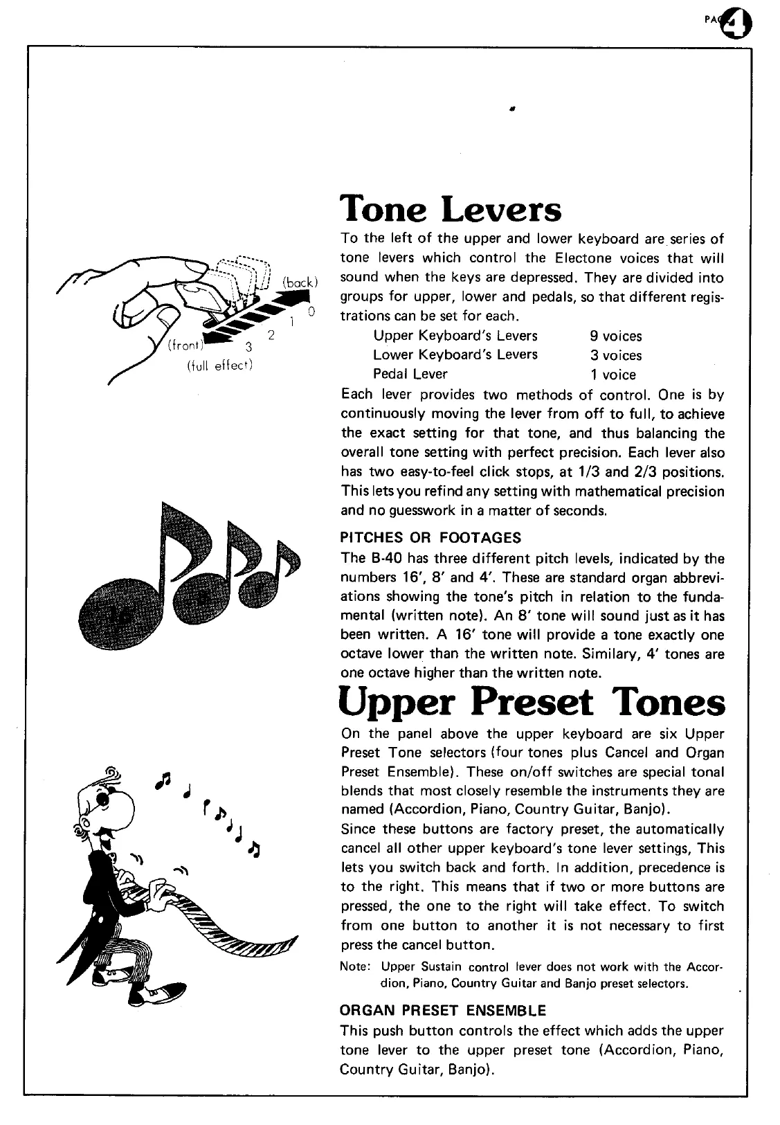 Yamaha Electone B-40 - Tone Levers; Upper Preset Tones; Pitches or Footages; Organ Preset Ensemble