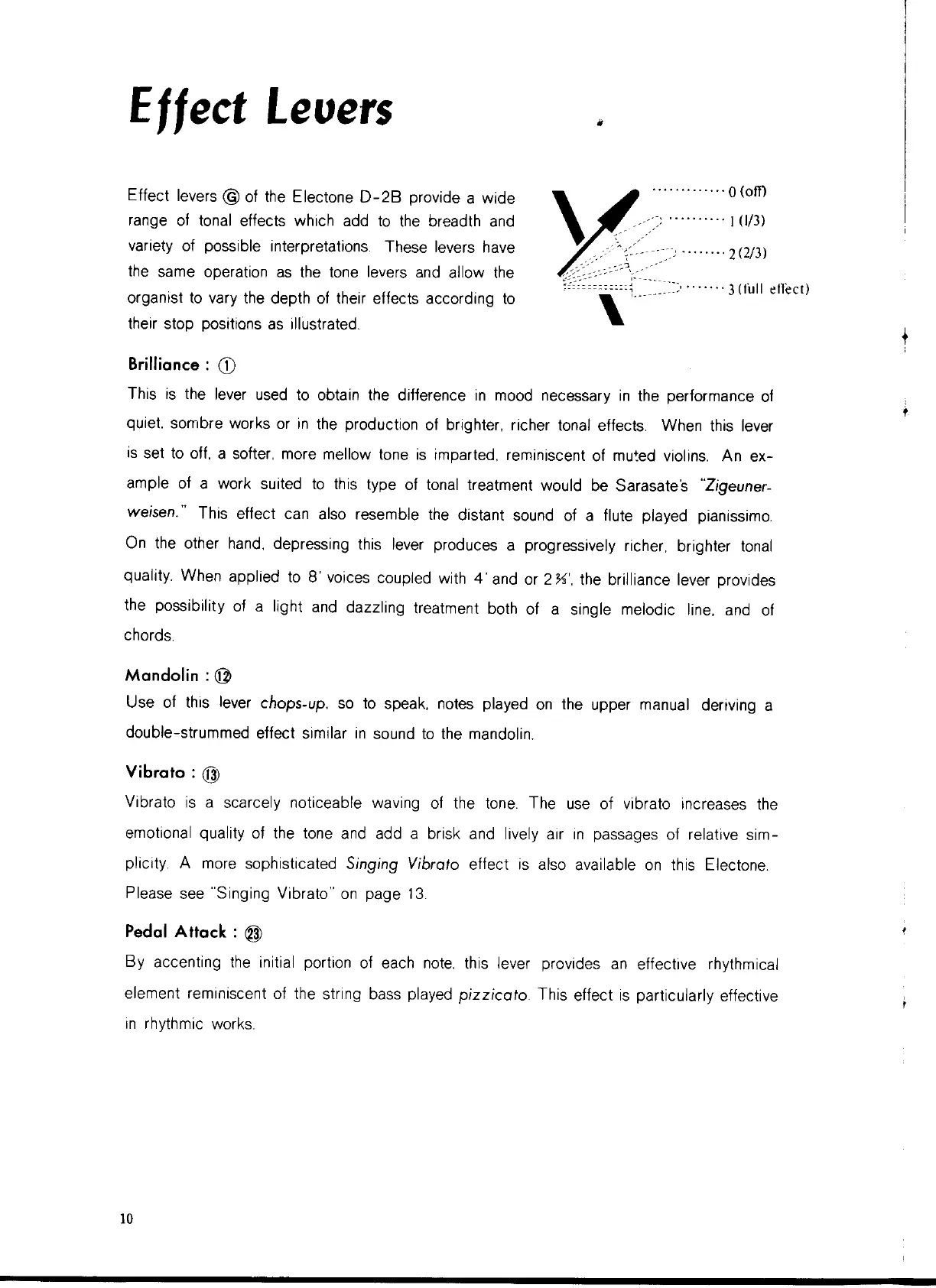 Yamaha Electone D-2B - Effect Levers for Expressive Playing; Brilliance Effect Lever; Mandolin Effect Lever; Vibrato Effect Lever