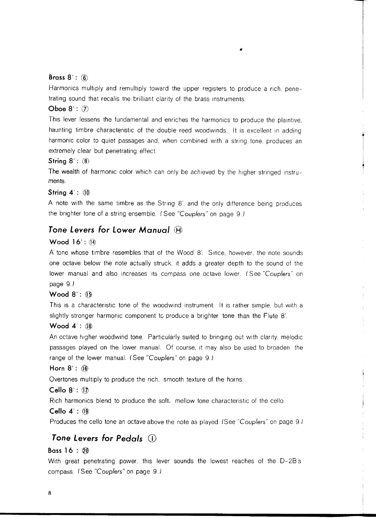 Yamaha Electone D-2B - Tone Levers for Lower Manual and Pedals; Tone Levers for Lower Manual; Tone Levers for Pedals