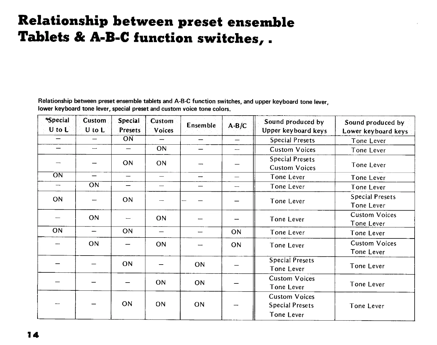 Yamaha Electone D-85 - Relationship between Preset Ensemble Tablets & A-B-C Function Switches, and Upper Keyboard Tone Lever, Lower Keyboard Tone Lever, Special Preset and C