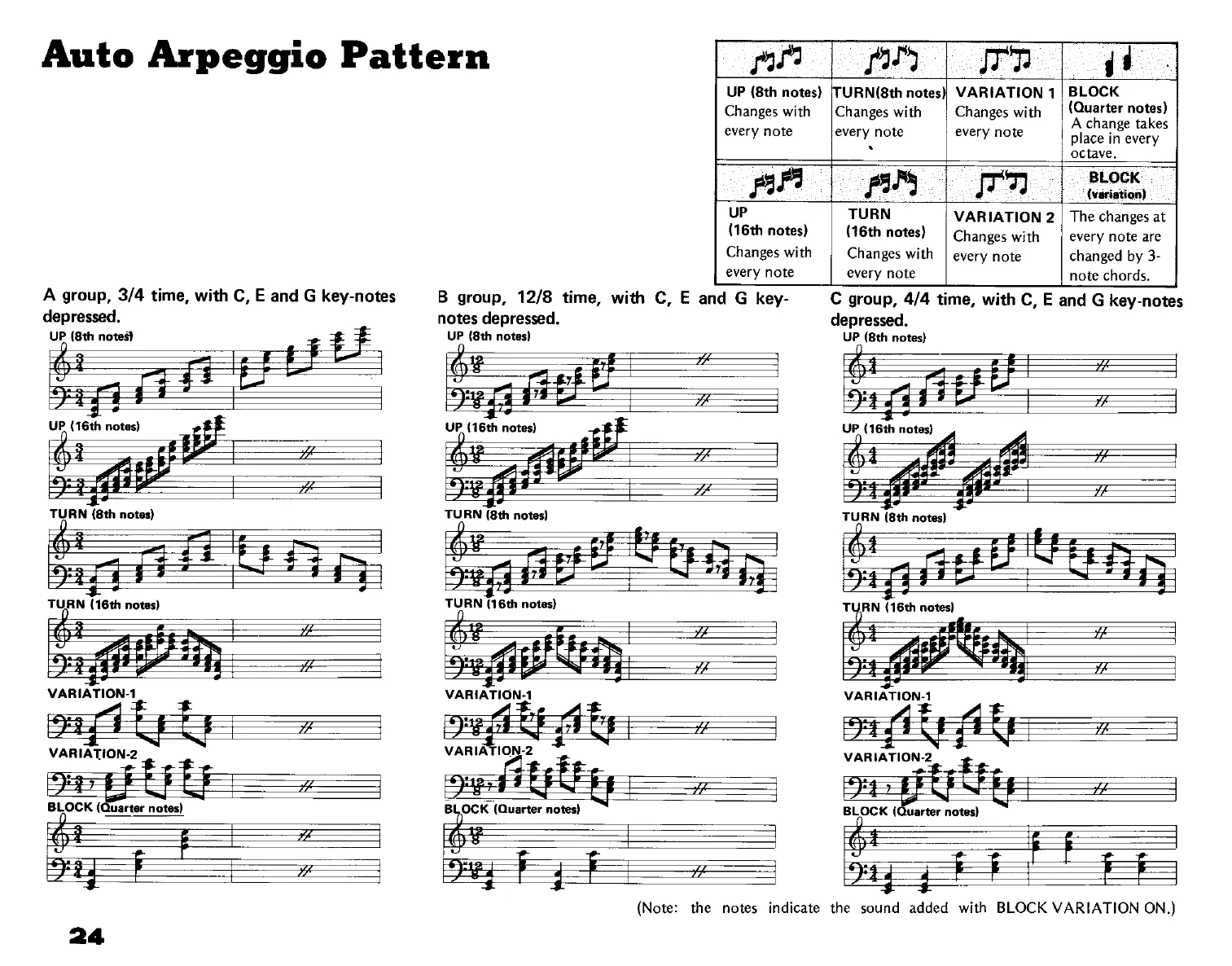 Yamaha Electone D-85 - Auto Arpeggio Pattern; A Group, 3;4 Time, with C, E and G Key-Notes Depressed; B Group, 12;8 Time, with C, E and G Key-Notes Depressed; C Group, 4;4 Time, with C, E and G Key-Notes Depressed