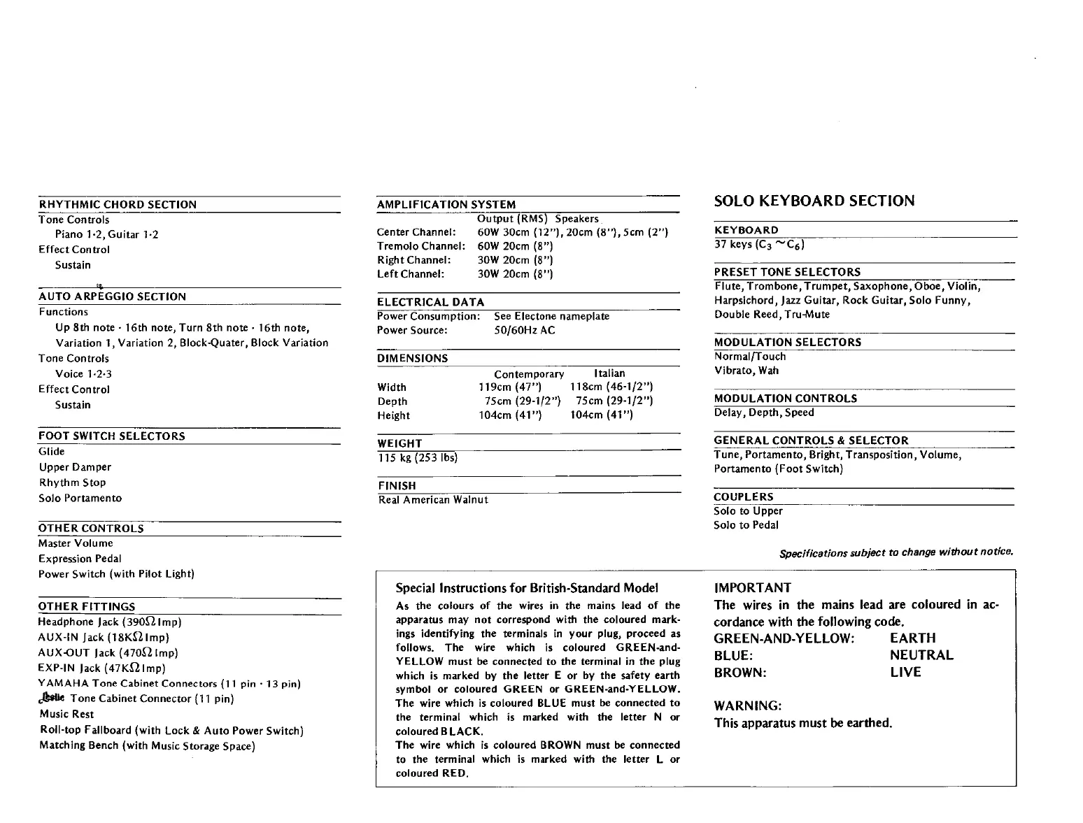 Yamaha Electone D-85 - Detailed Specifications and Wiring
