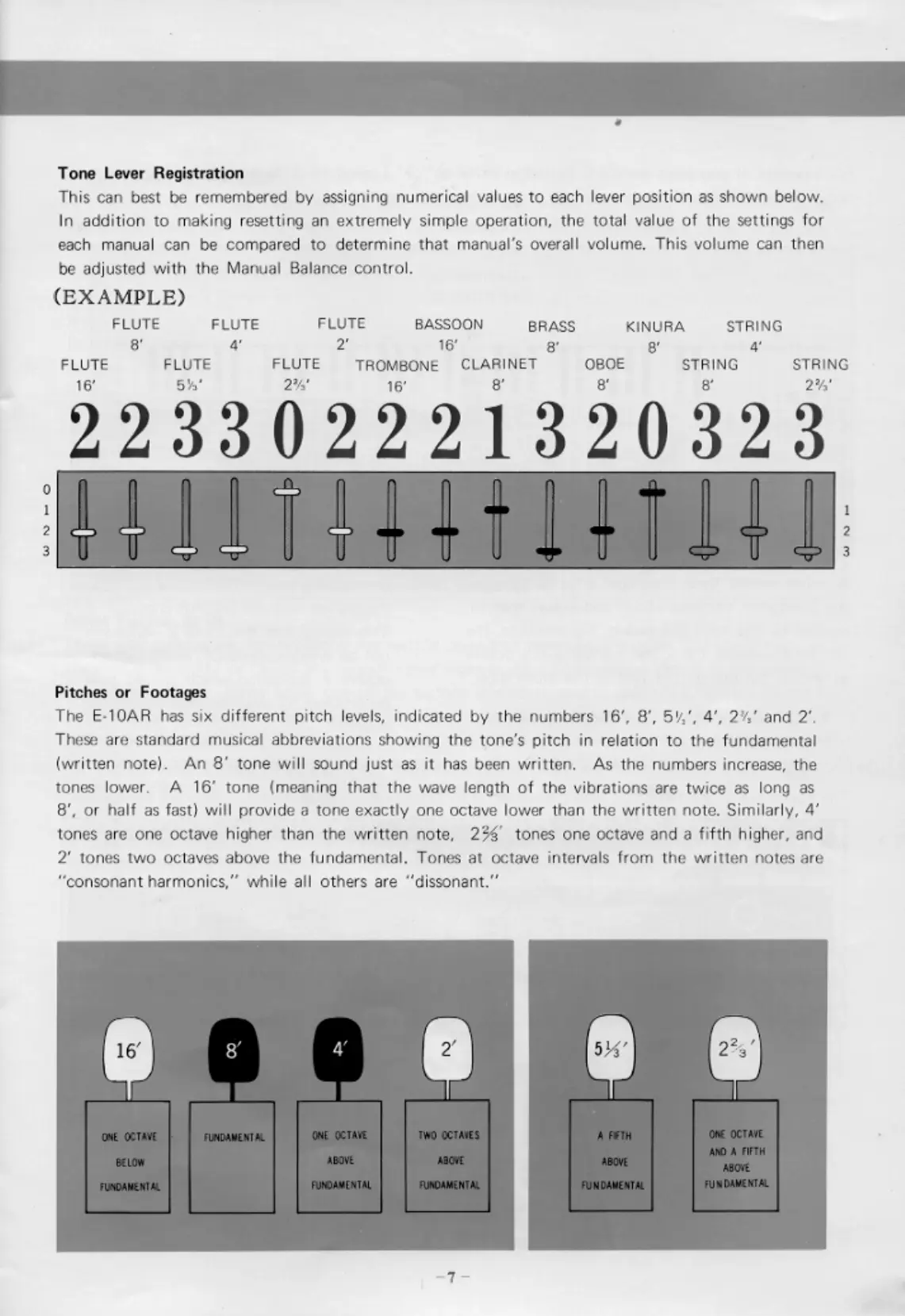 Yamaha Electone E-10AR - Tone Lever Registration; Pitches or Footages