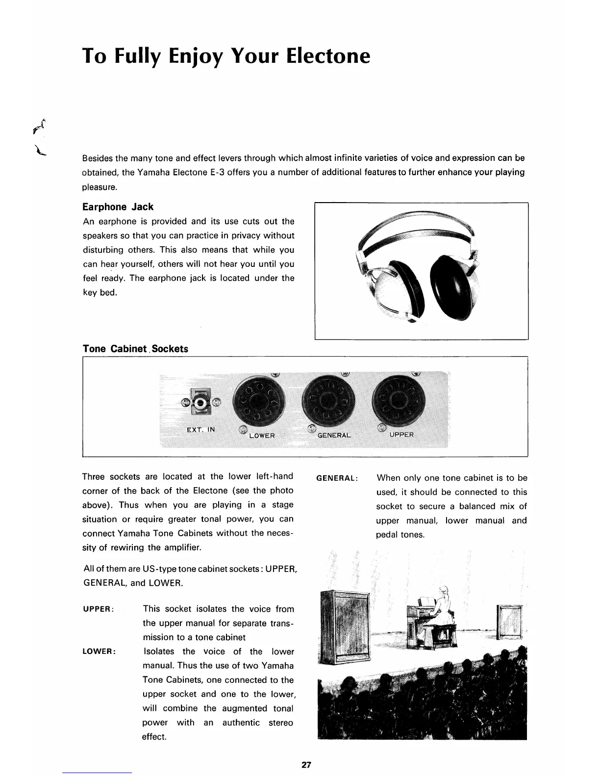 Yamaha Electone E-3 - Earphone Jack; Tone Cabinet Sockets