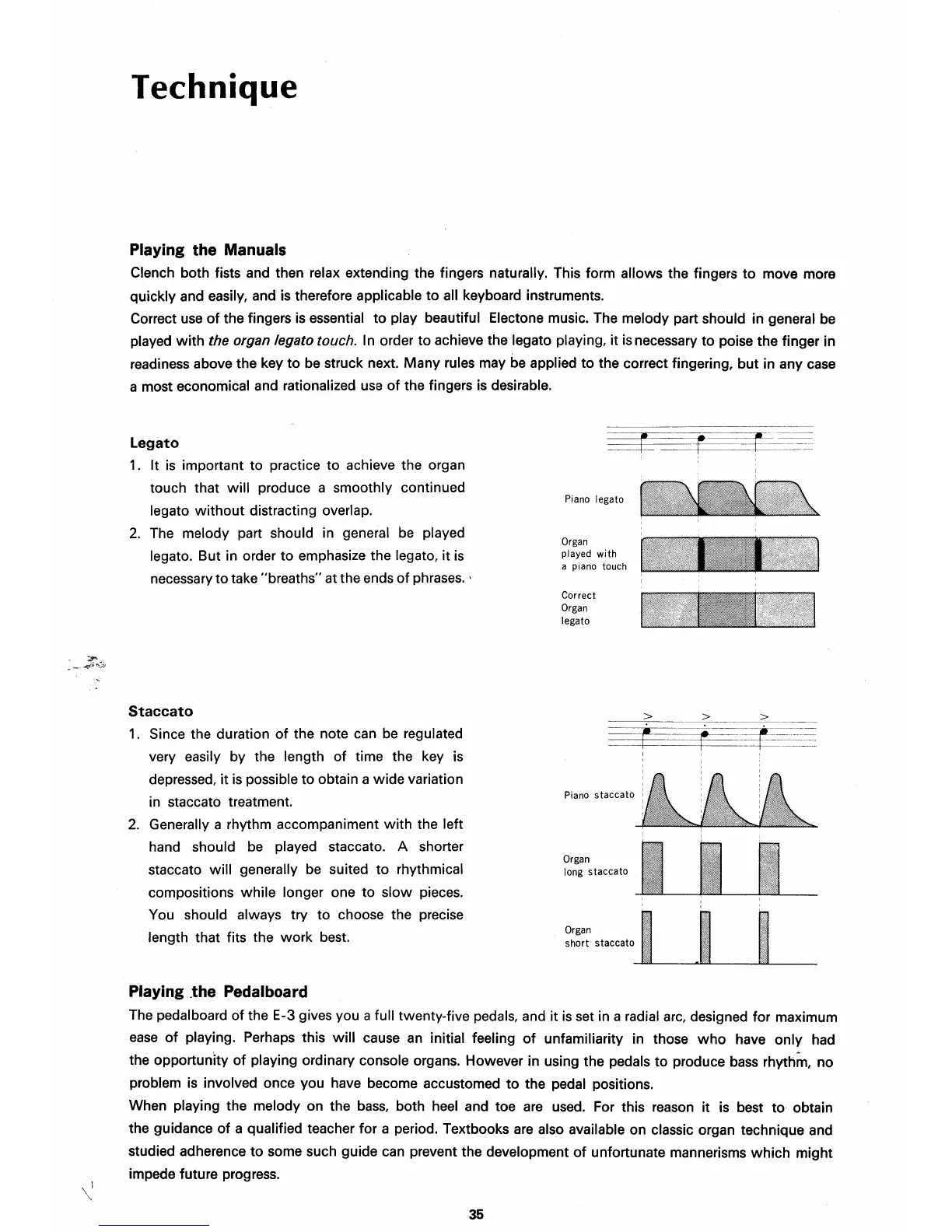 Yamaha Electone E-3 - Technique; Playing the Manuals; Legato;Staccato; Playing the Pedalboard
