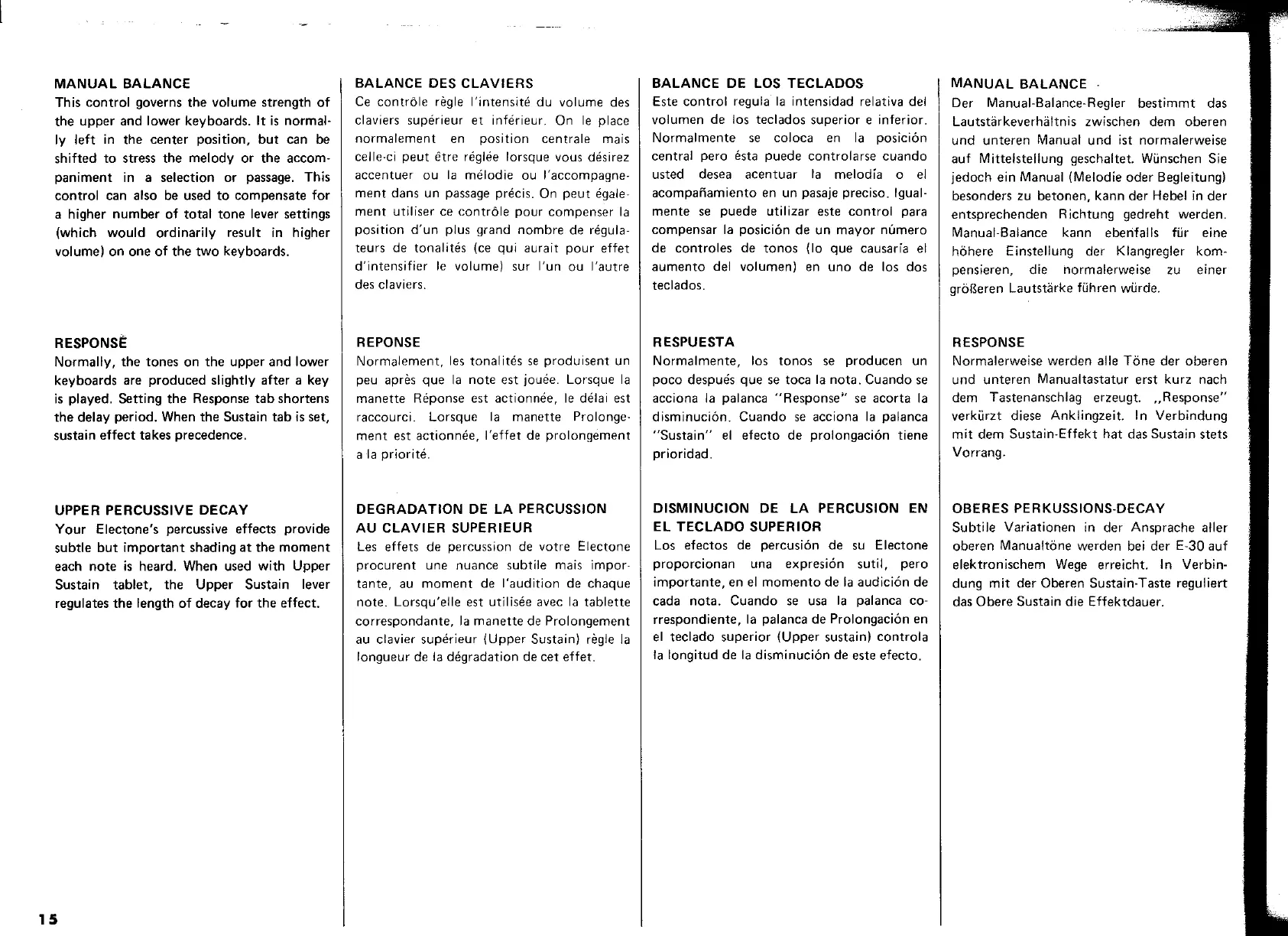 Yamaha Electone E-30 - MANUAL BALANCE; RESPONSE; UPPER PERCUSSIVE DECAY