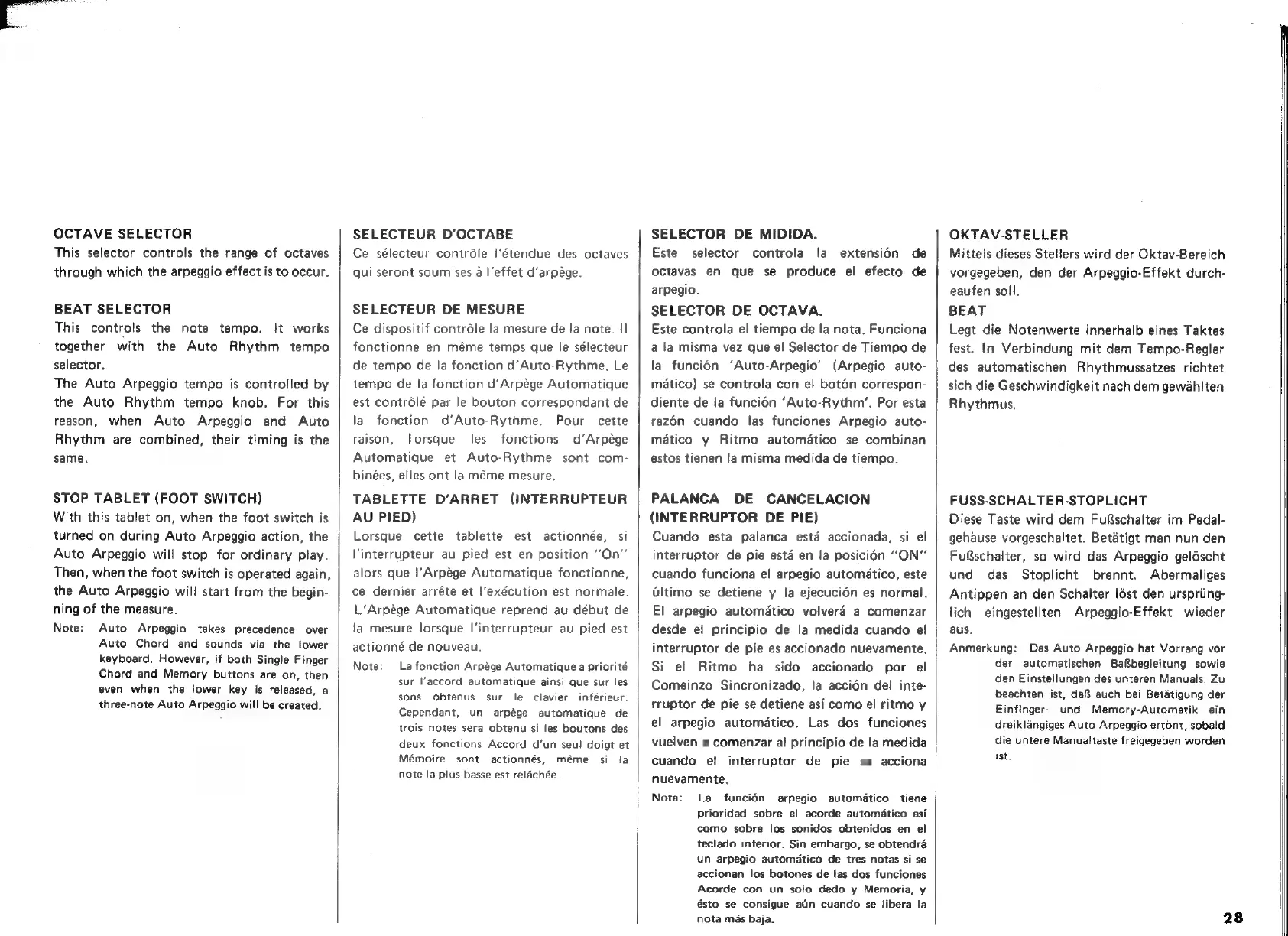 Yamaha Electone E-30 - OCTAVE SELECTOR; BEAT SELECTOR; STOP TABLET (FOOT SWITCH)