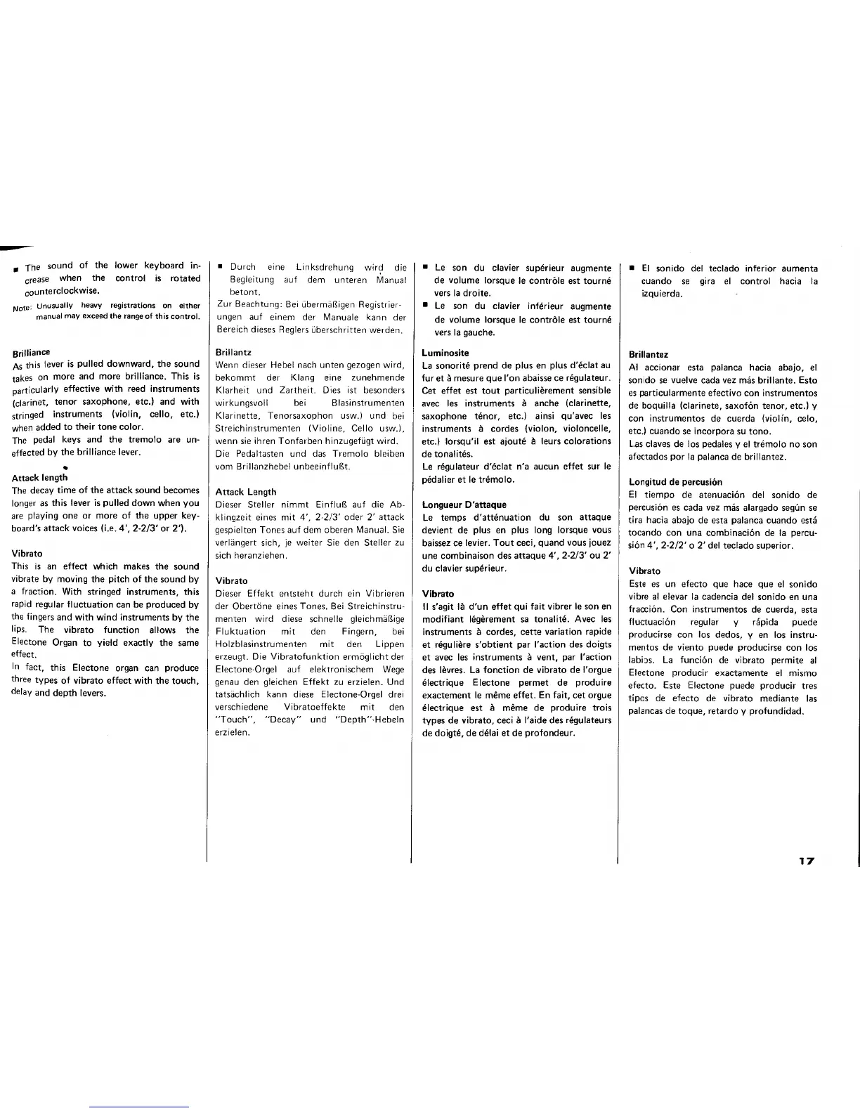 Yamaha Electone E-45 - Keyboard Sound Modification Controls; Adjusting Brilliance and Attack Length; Vibrato Effect Operation