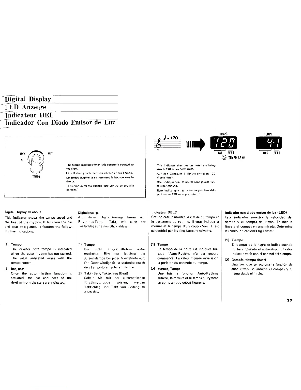 Yamaha Electone E-45 - Digital Display Indicators; Tempo and Beat Display Information