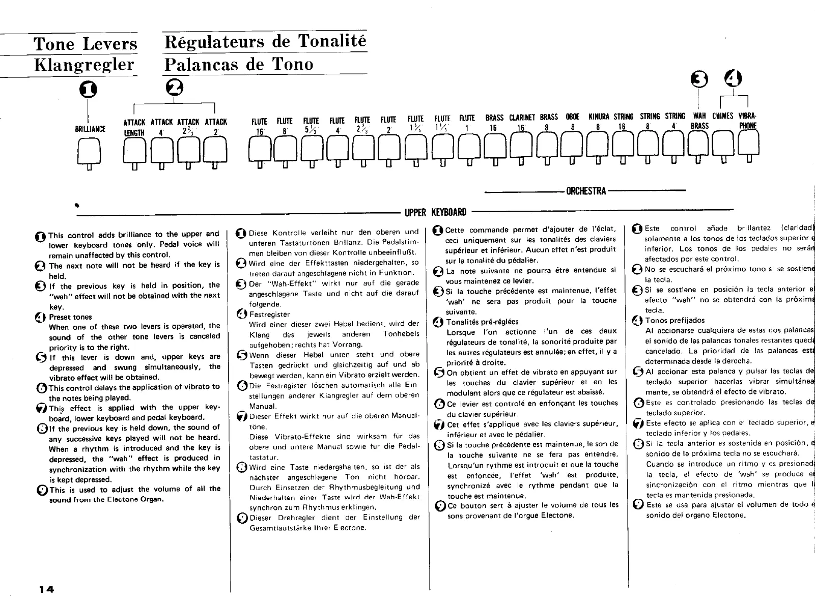 Yamaha Electone E-45 - Tone Lever Controls and Sound Adjustment; Brilliance, Attack Length, and Vibrato Controls