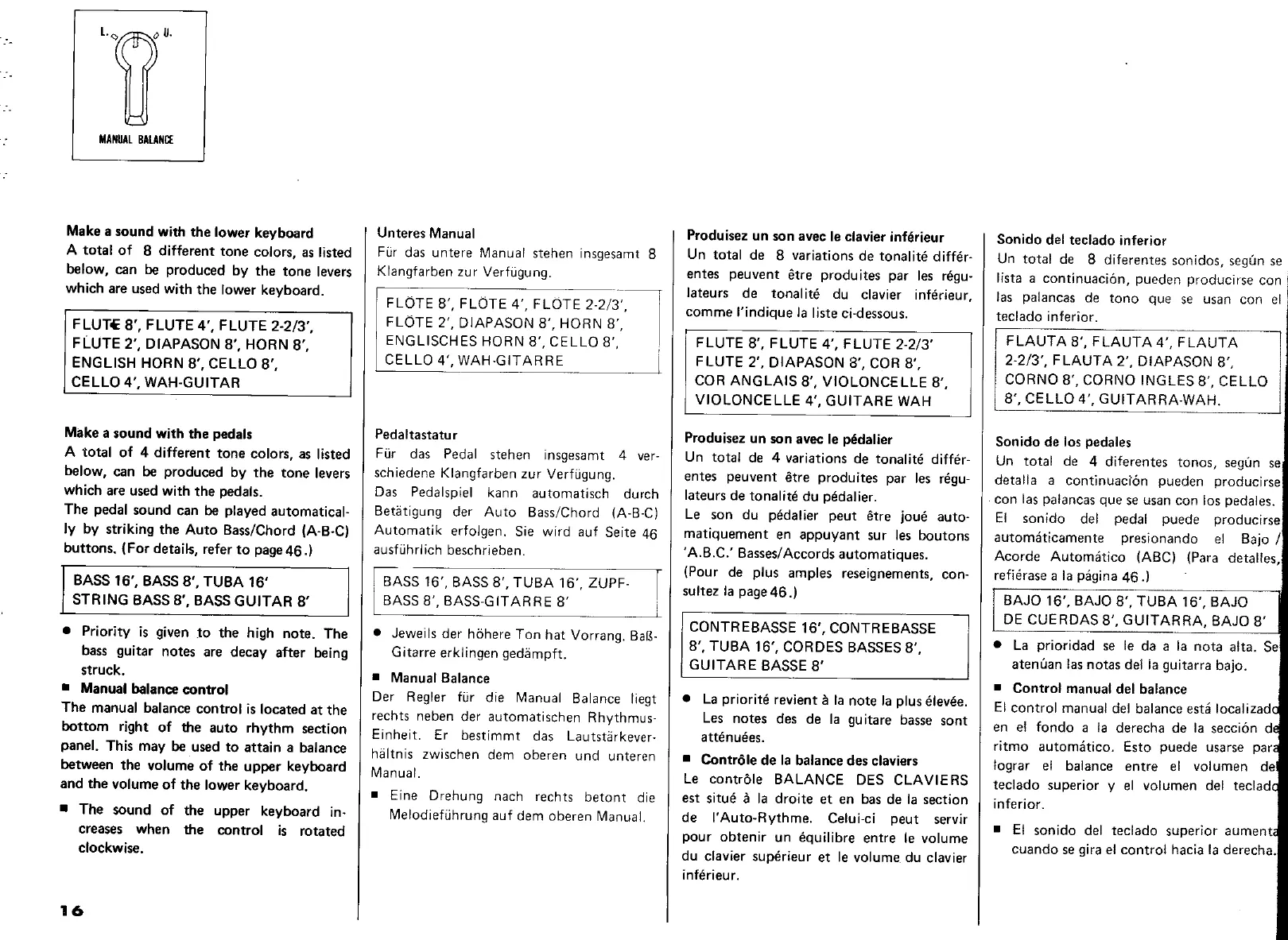 Yamaha Electone E-45 - Lower Keyboard and Pedal Tone Options; Manual Balance Control Operation