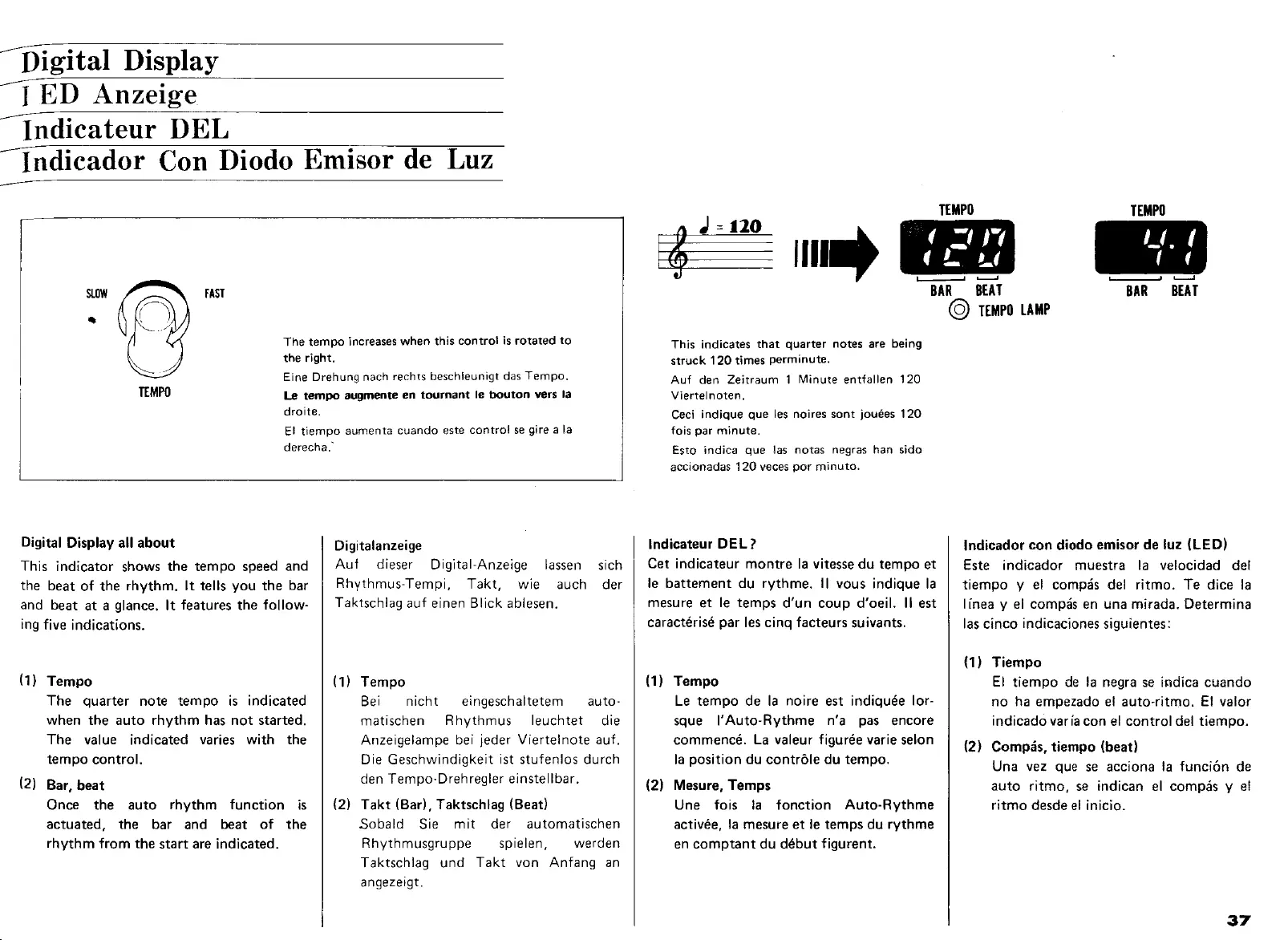Yamaha Electone E-45 - Digital Display Indicators; Tempo and Beat Display Information