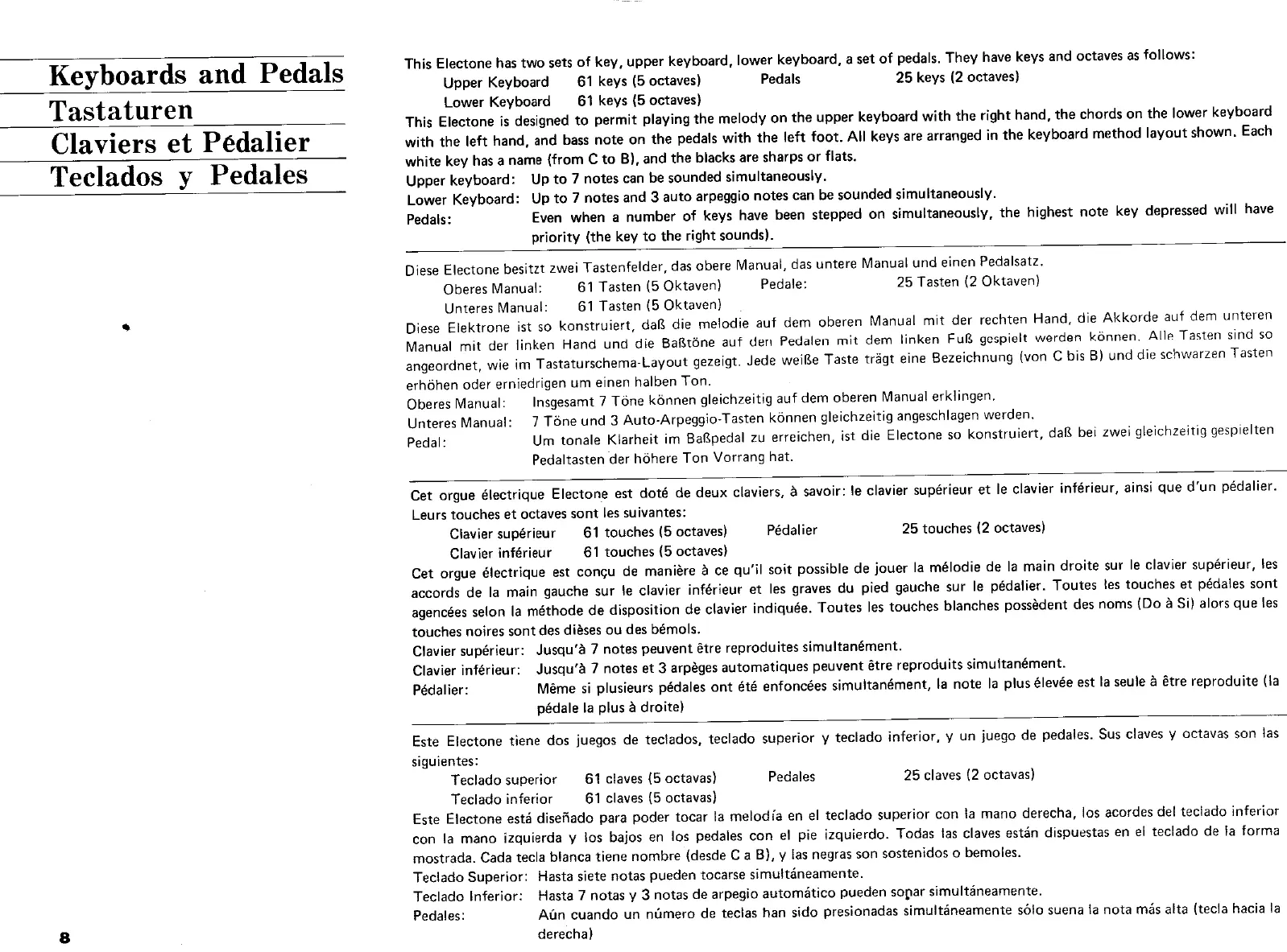 Yamaha Electone E-45 - Electone Keyboard and Pedal Layout; Key and Octave Specifications