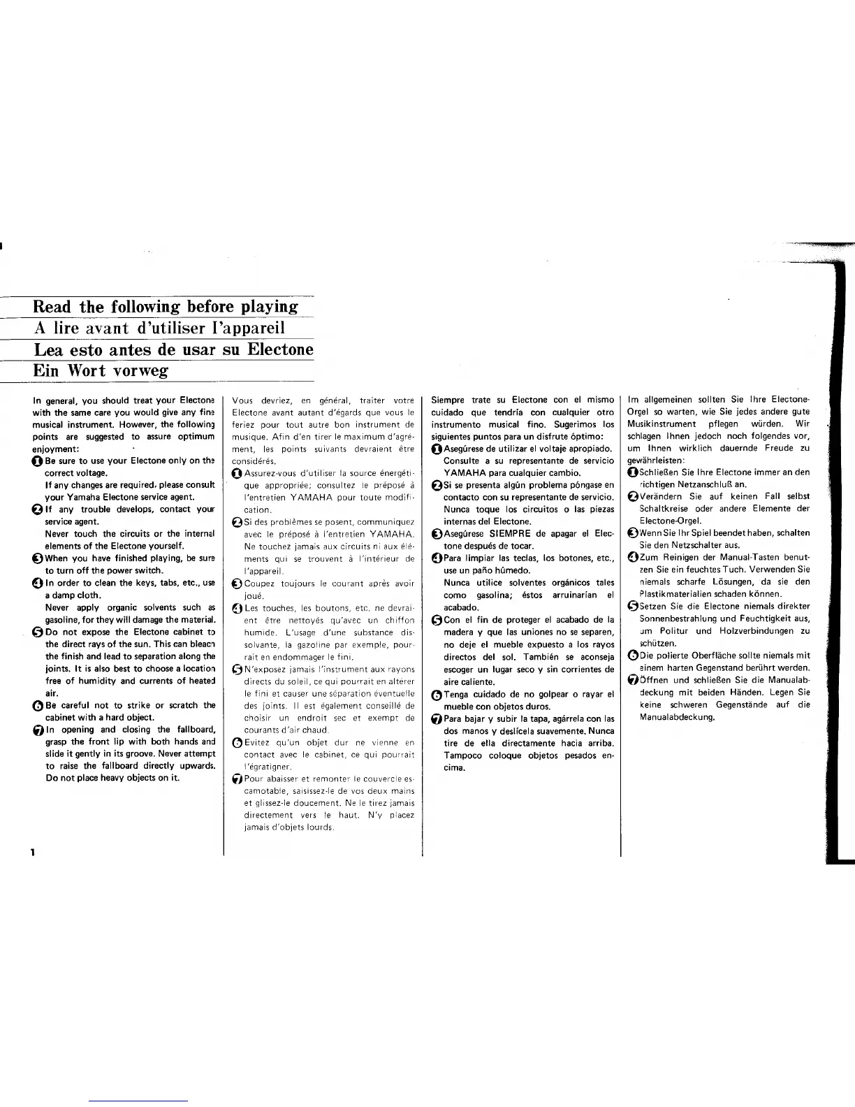 Yamaha Electone E-50 - Before Playing: Essential Instructions