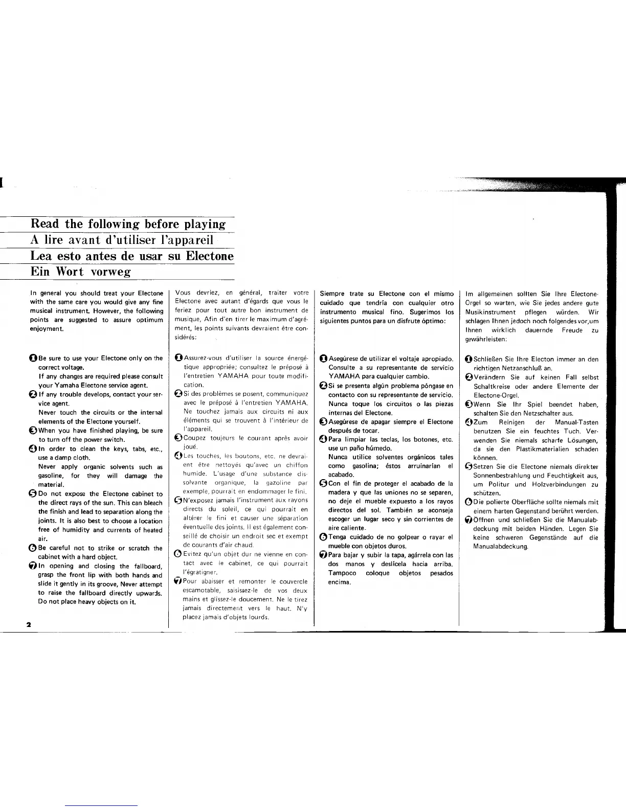 Yamaha Electone E-70 - Pre-Play Safety and Operation