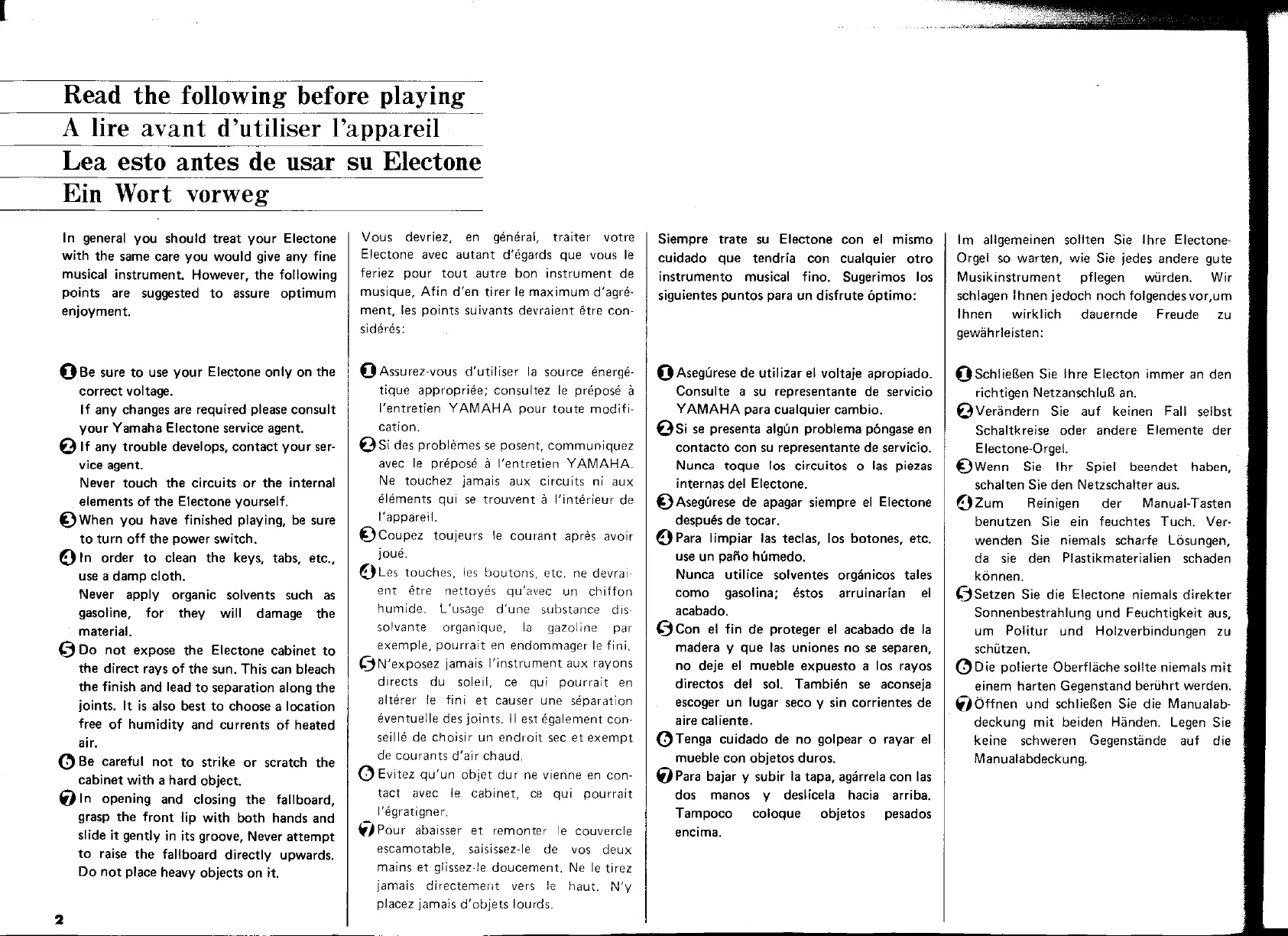 Yamaha Electone E-70 - Pre-Play Safety and Operation