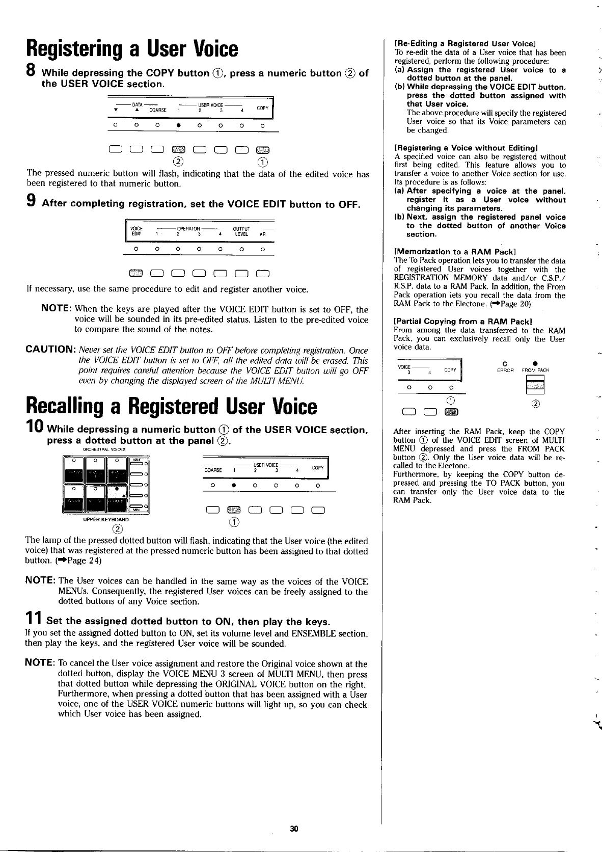 Yamaha Electone HS-4 - Registering a User Voice; Recalling a Registered User Voice; Re-Editing a Registered User Voice; Memorization to a RAM Pack