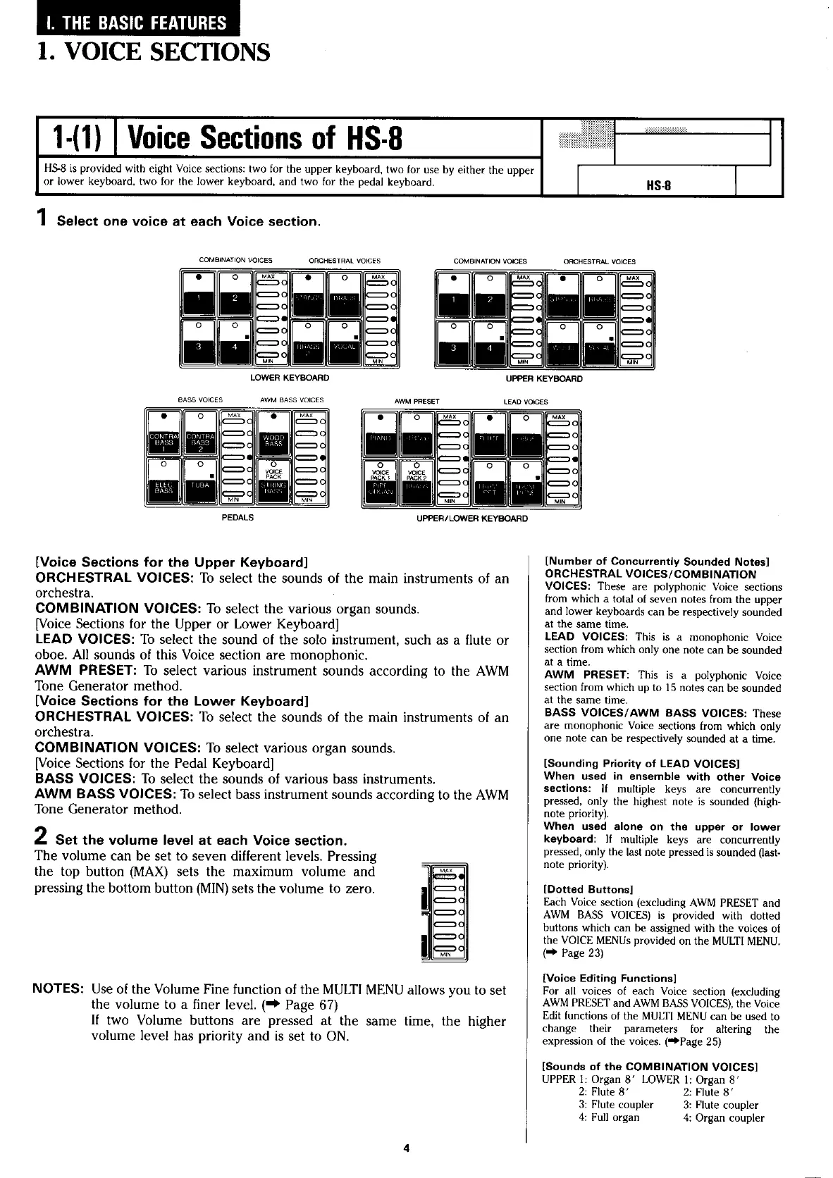 Yamaha Electone HS-4 - Voice Sections; Voice Sections of HS-8; Number of Concurrently Sounded Notes; Dotted Buttons