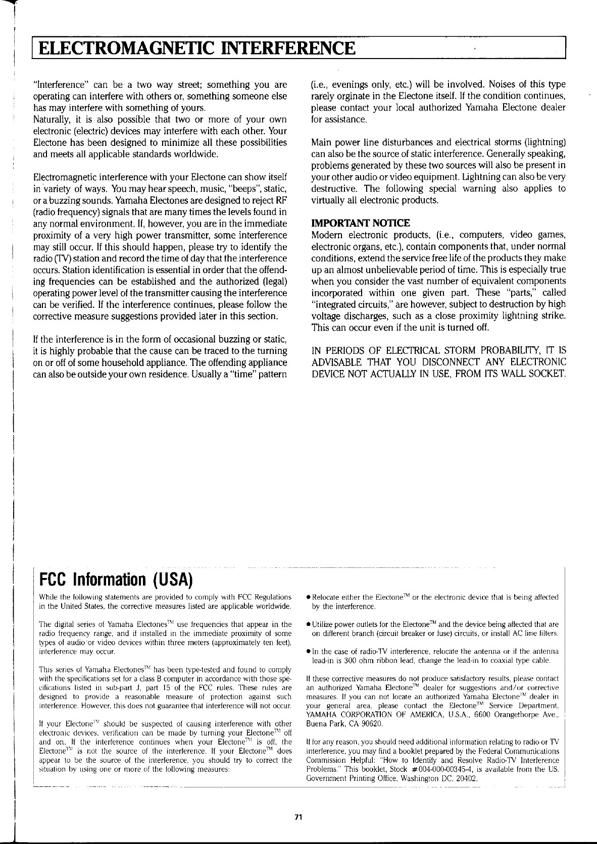 Yamaha Electone HS-4 - Electromagnetic Interference; Important Notice