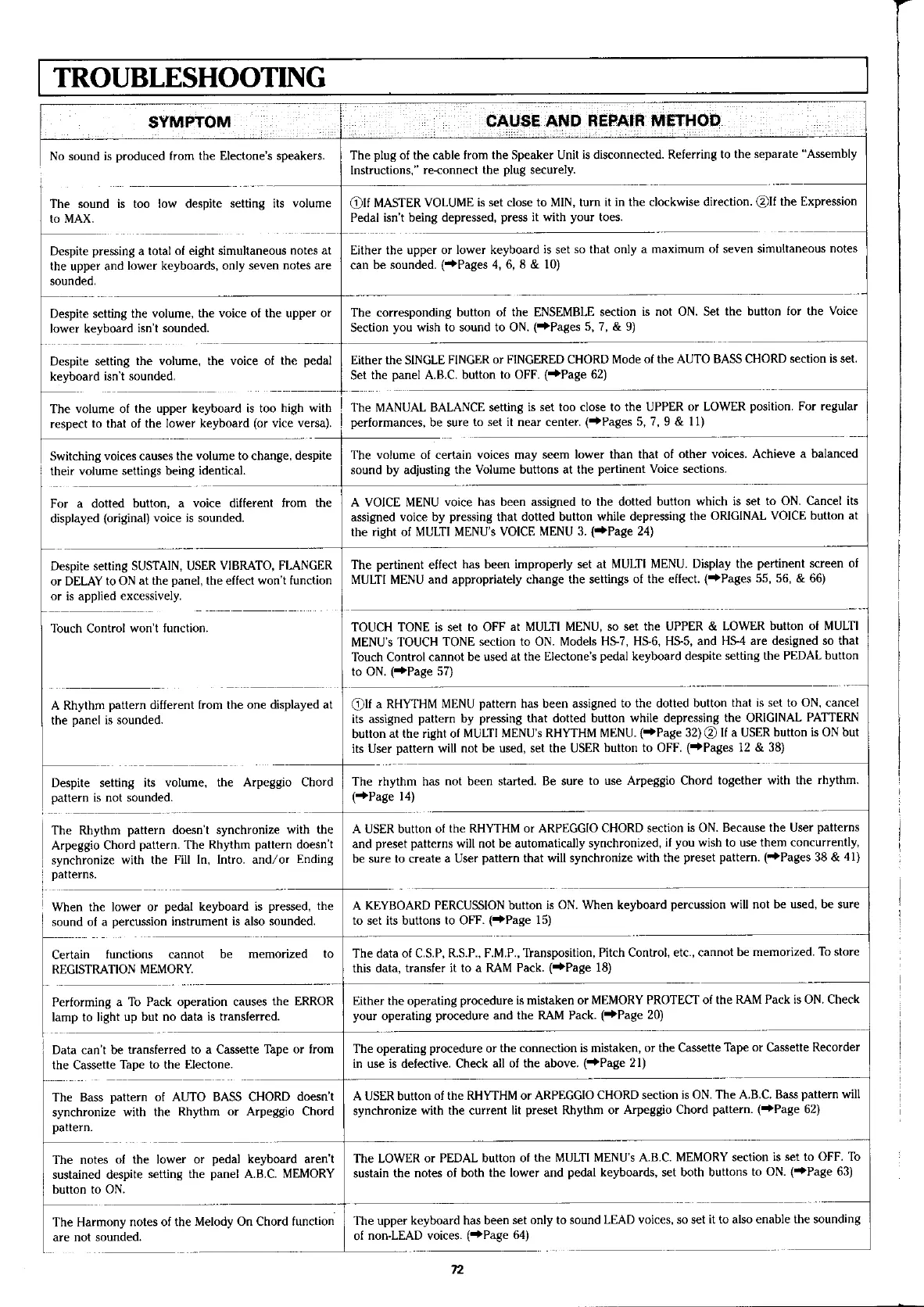 Yamaha Electone HS-4 - Troubleshooting