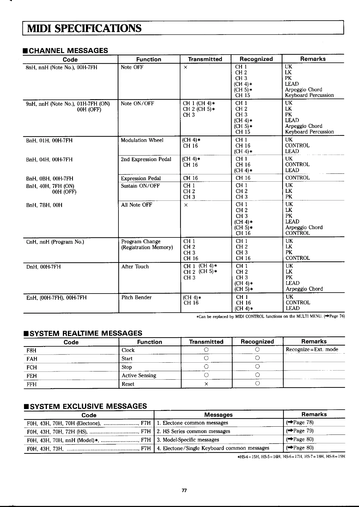 Yamaha Electone HS-4 - MIDI Specifications; Channel Messages; System Realtime Messages; System Exclusive Messages