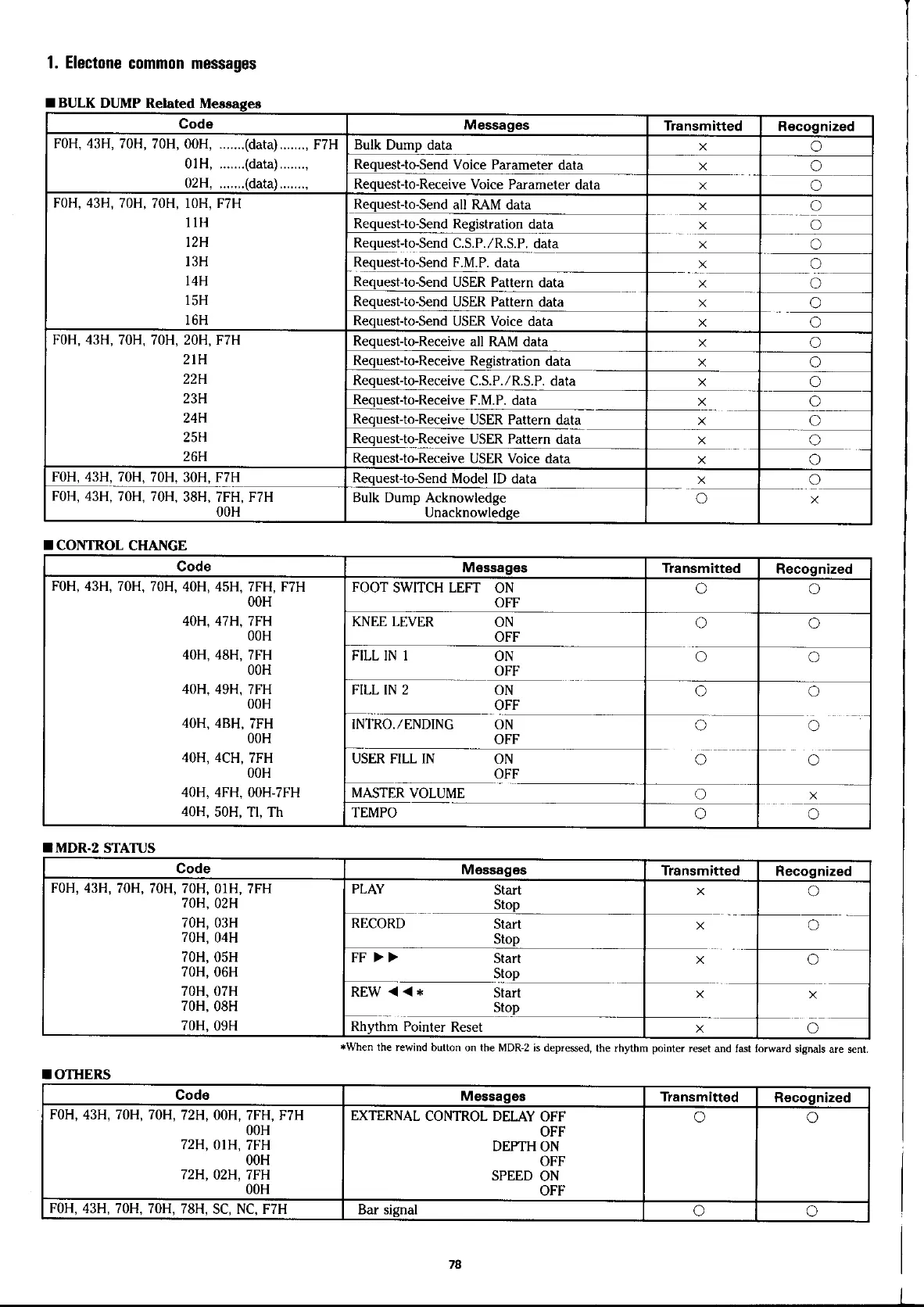 Yamaha Electone HS-4 - Electone Common Messages; BULK DUMP Related Mesages; Control Change; MDR-2 Status