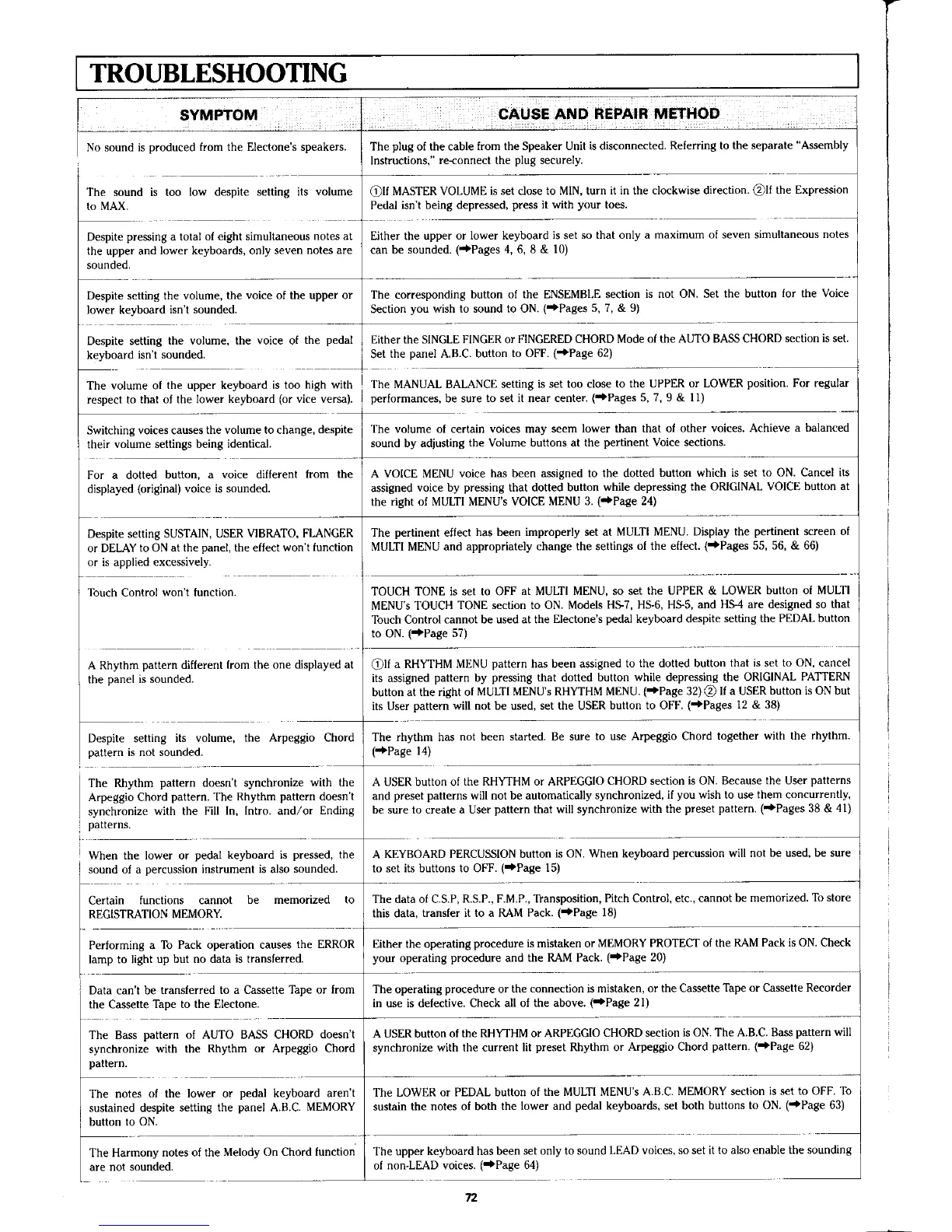 Yamaha Electone HS - TROUBLESHOOTING