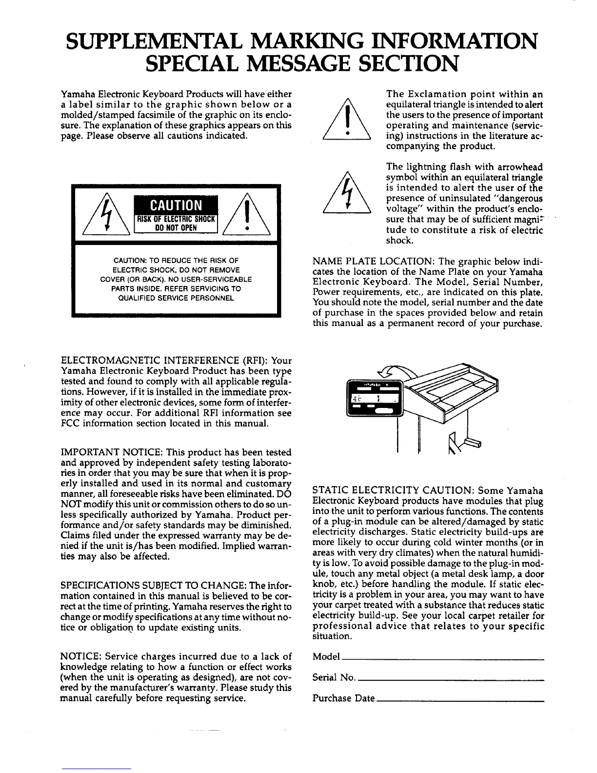 Yamaha Electone US-1 - Supplemental Marking Information; Special Message Section; Electromagnetic Interference (RFI); Important Safety Notice