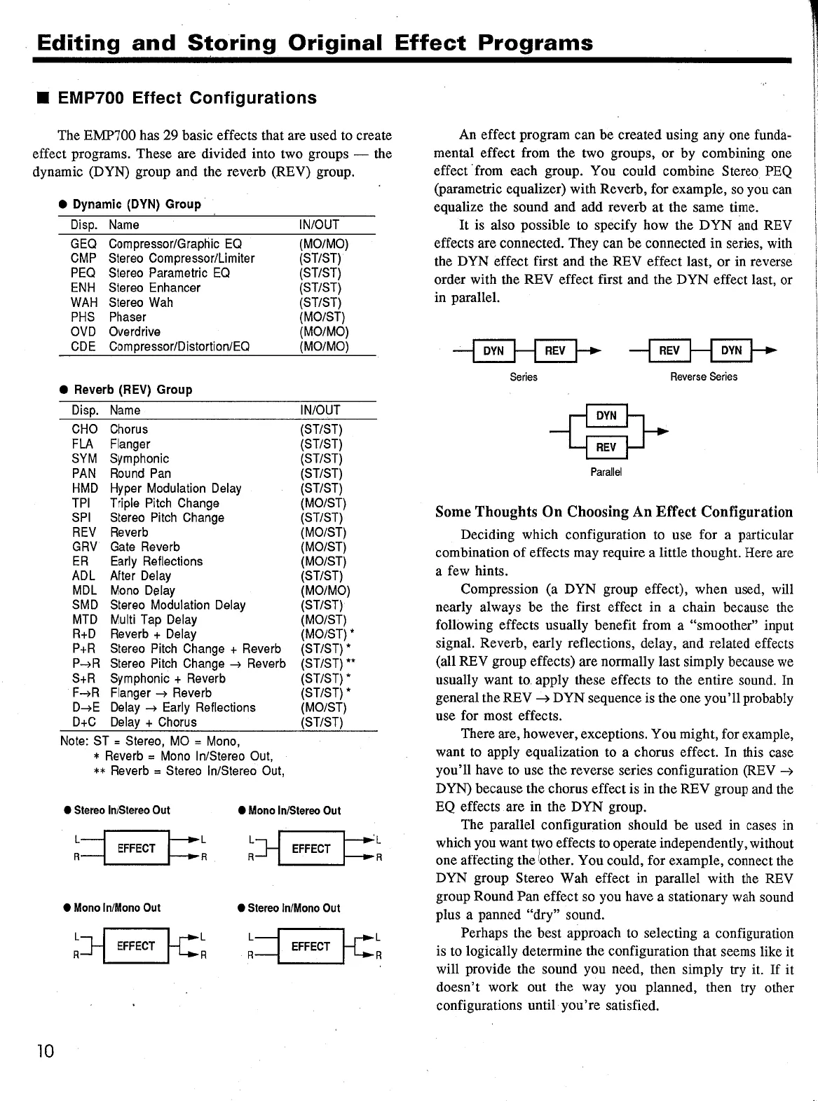 Yamaha EMP700 - Editing and Storing Custom Effect Programs; Effect Combination Configurations; Dynamic (DYN) Effects List; Reverb (REV) Effects List