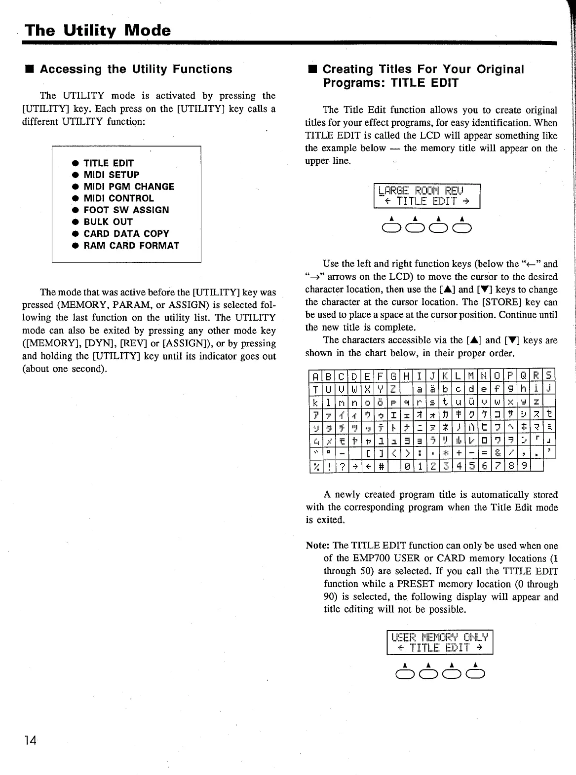 Yamaha EMP700 - Utility Mode Functions and Settings; Accessing Utility Functions; Creating Program Titles (Title Edit)